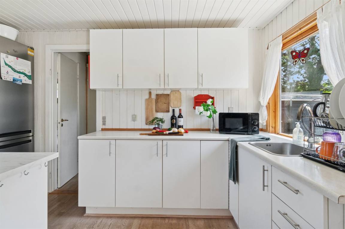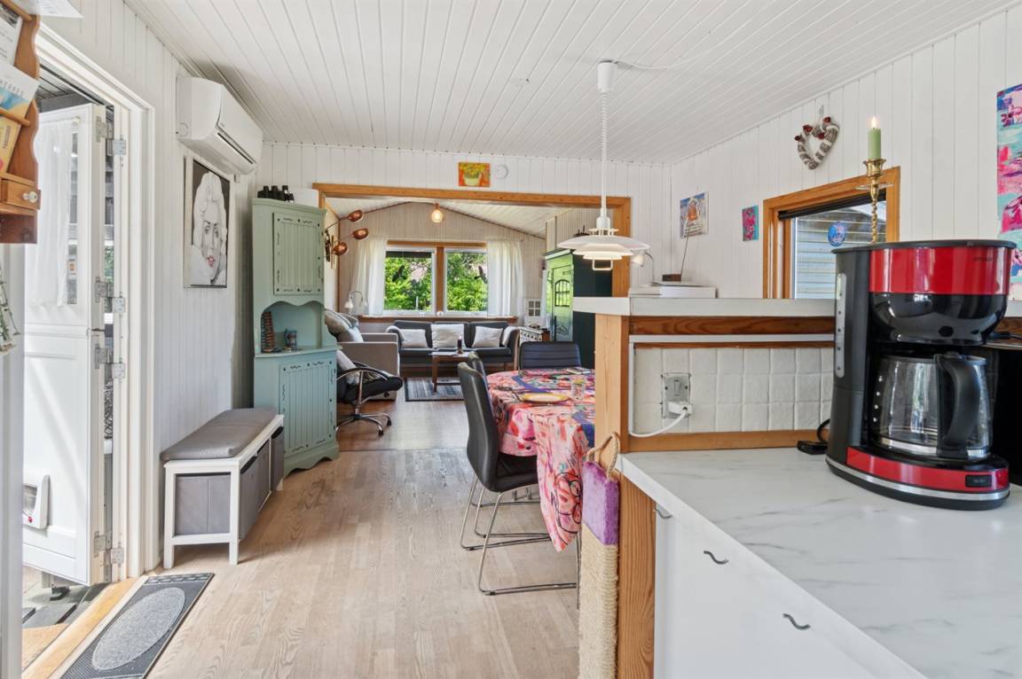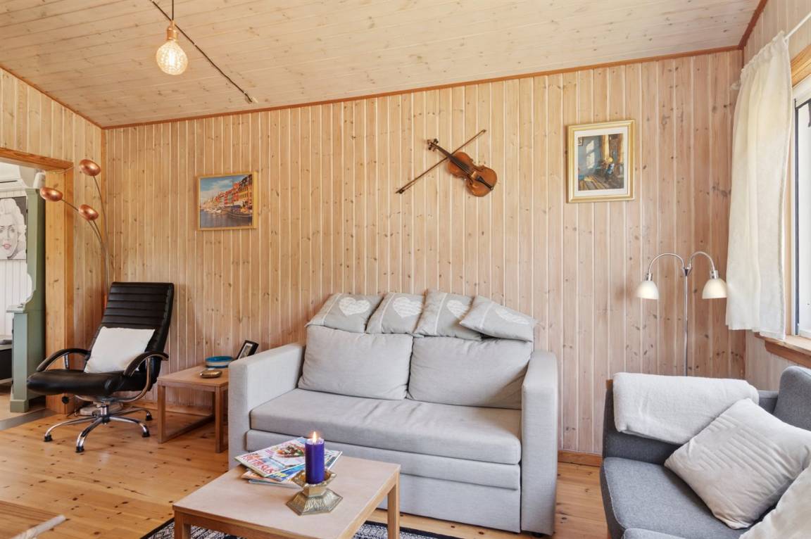 Dieses Ferienhaus lädt zum gemütlichen Beisammensein auf der geschlossenen und teilweise überdachten Terrasse oder im Haus ein, wo ein offener Koch-, Ess- und Wohnbereich auf Sie wartet. Das Haus verfügt über zwei Schlafzimmer, eines mit Doppelbett und das andere mit einem Doppelschlafcouch. Im Wohnzimmer gibt es zusätzlich 2 Schlafplätze auf einer Doppelschlafcouch. Das Badezimmer ist mit Duschnische, Fußbodenheizung und einer Waschmaschine ausgestattet.