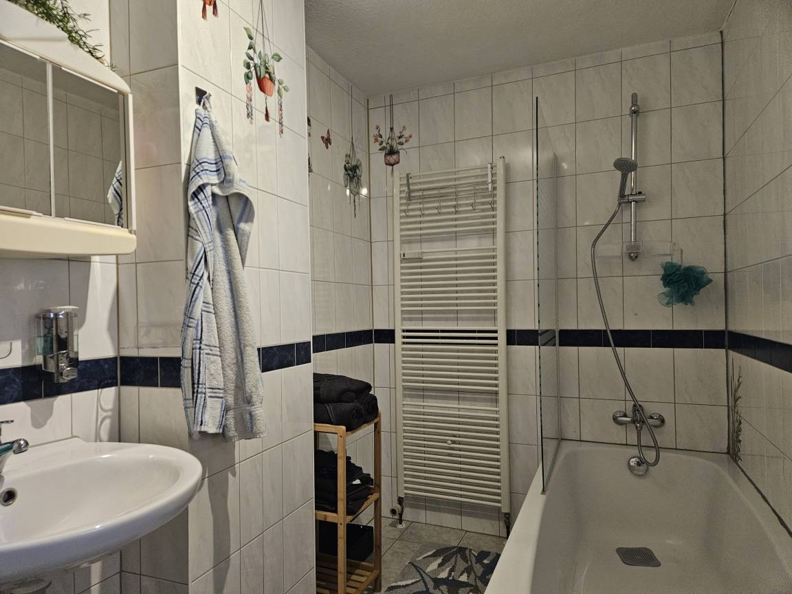 Zwei Stufen führen hinab ins weiß gekachelte, Tageslicht- Wannenbad / WC.
