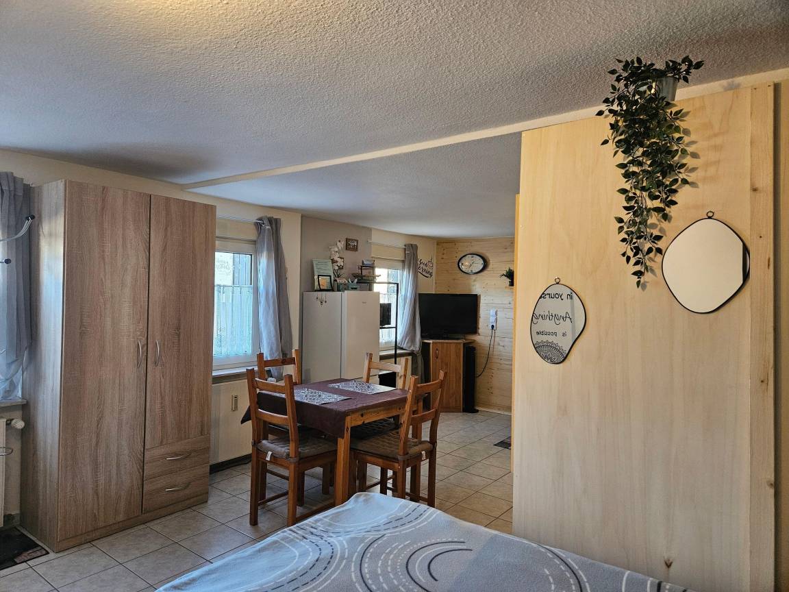 Ein Schrank als Raumteiler trennen den Koch- und Essecke optisch vom, mit zwei Diwanbetten ausgestatteten, Schlafbereich.