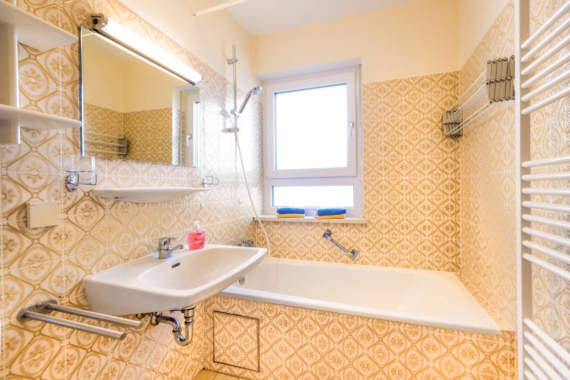 Besonders angenehm ist das Tageslicht im Badezimmer mit Badewanne und Toilette.
