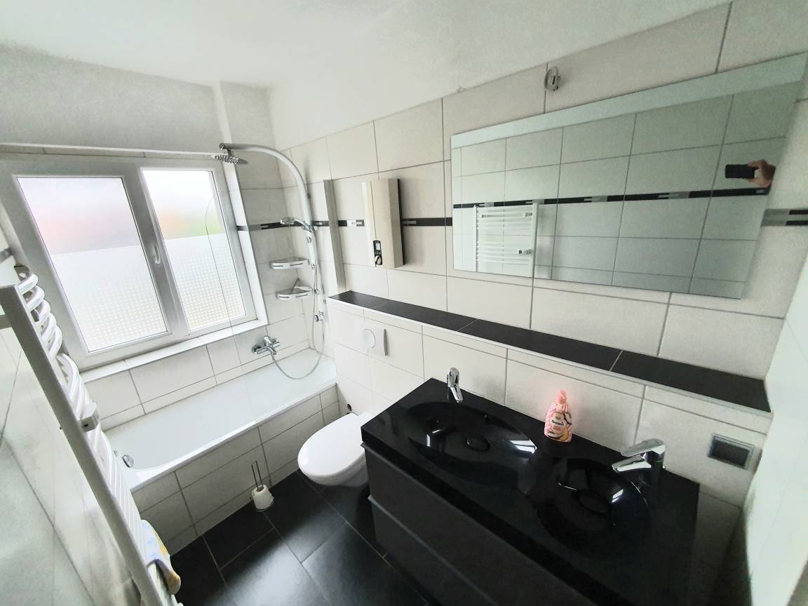 Ein Badezimmer mit Badewanne und WC. 3 Schlafzimmer und ein Wohnzimmer. Voll ausgestattete Küche.