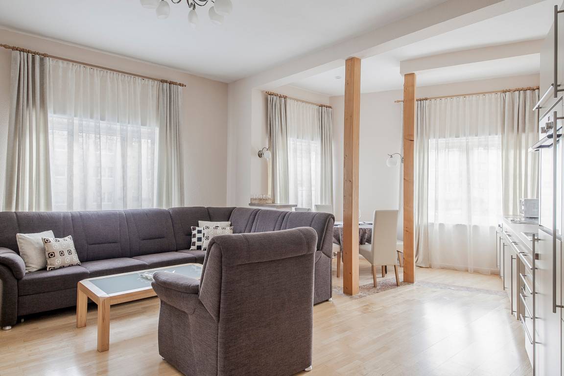 Die Ferienwohnung Deluxe verfügt auf der gesamten Fläche über einen edlen, hellen Parkettfußboden mit drei eingebauten LED-Leuchten im Essbereich. Im großzügigen Wohnraum befindet sich eine einladende Couchgarnitur, ein Couchtisch aus hochwertigem, massivem Holz, und im Medienbereich ein 139 cm (55 Zoll) großes Full-HD-Flat-TV mit WLAN Anschluss, das Sie nach einem erlebnisreichen Tag im Freien oder auch beim entspannenden "Couchtag" mit Kinoatmosphäre verwöhnt und Ihnen durch außergewöhnliche Filmerlebnisse oder auch die hautnahe Verfolgung von Sportübertragungen einen besonderen Urlaubsaufenthalt garantiert.