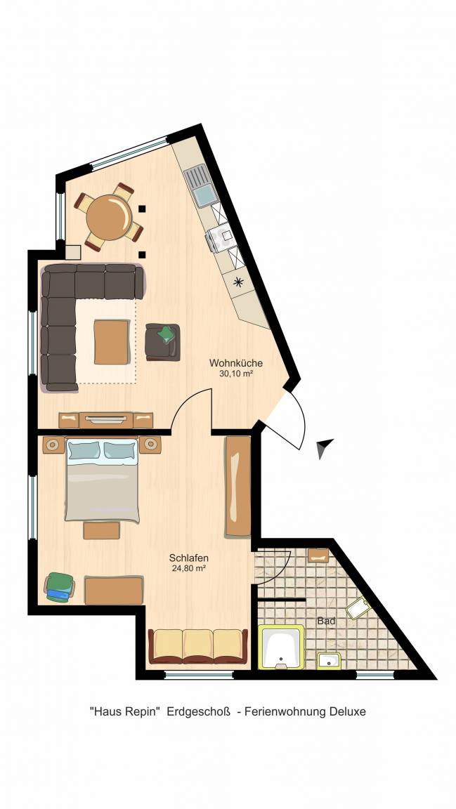Auf etwa 60 qm bietet Ihnen unsere Ferienwohnung Deluxe reichlich Platz für 2 bis max. 5 Personen (+ Kinderbett). Das Premium-Apartment ist modern und komfortabel mit hochwertigen Materialien, neuesten Medien und exquisitem Mobiliar ausgestattet und befindet sich im Erdgeschoss des Haus Repin. Die Ferienwohnung Deluxe wurde 2016 nach der DTV-Klassifizierung bewertet und mit 4 Sternen bezeichnet