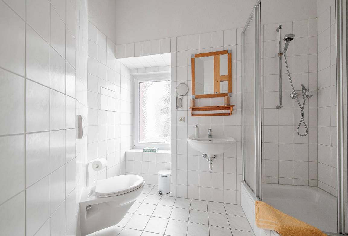Dusche und WC finden Sie im ansprechenden Badezimmer mit Fenster. Frische Hand- und Badetücher werden Ihnen für die Dauer des Aufenthaltes gestellt.