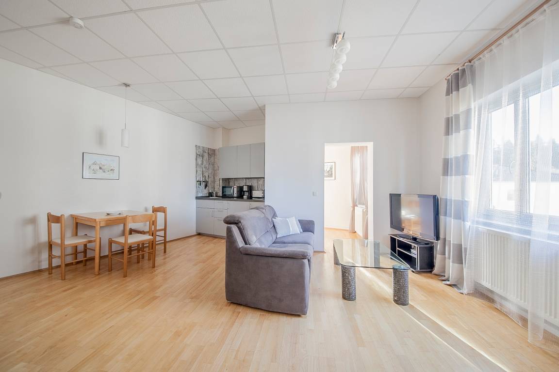 Die Ferienwohnung 2 verfügt auf der gesamten Fläche über einen edlen Parkettfußboden. Im großzügigen Wohnraum befindet sich eine einladende und moderne Couch, ein Tisch, und im Medienbereich Flachbild-TV, Sateliten-Receiver und CD-Radio. Daran angeschlossen ist außerdem eine Loggia, die sie beispielsweise als Sitzgelegenheit zum Entspannen oder Lesen oder auch einfach zum Abstellen von Koffern etc. nutzen können.