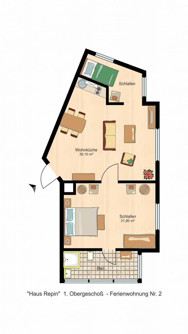 Auf etwa 60 m² bietet Ihnen unsere Ferienwohnung 2 reichlich Platz für 2 bis max. 4 Personen. Das Apartment ist modern und komfortabel mit hochwertigen Stoffen (z.B. Bettwäsche teilweise aus Maco-Satin) und neuen Medien ausgestattet und befindet sich im 1. Obergeschoss des Haus Repin.