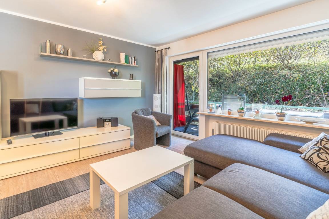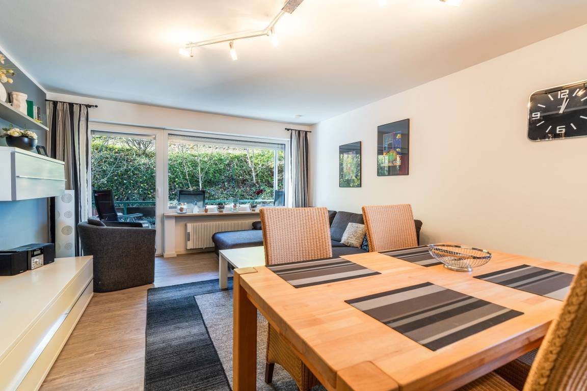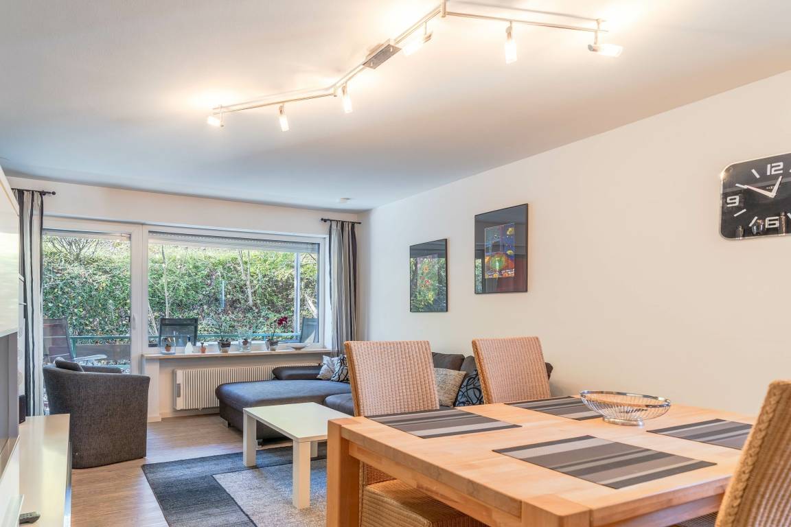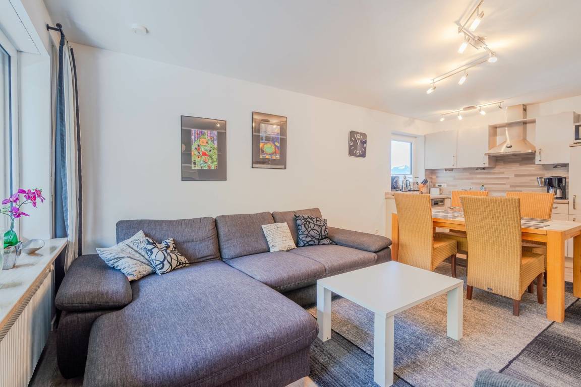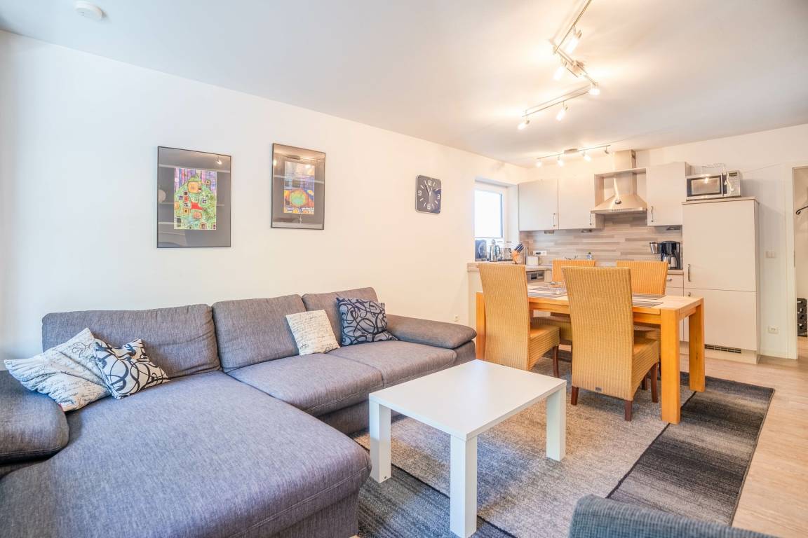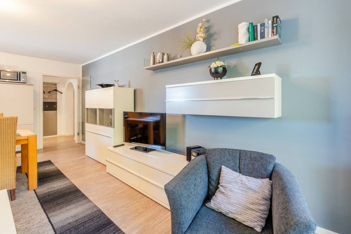 Im Wohnbereich steht ein komfortables Sofa, ebenso wie ein Fernseher für gemütliche Abendstunden. Die Wohnung verfügt über WLAN.