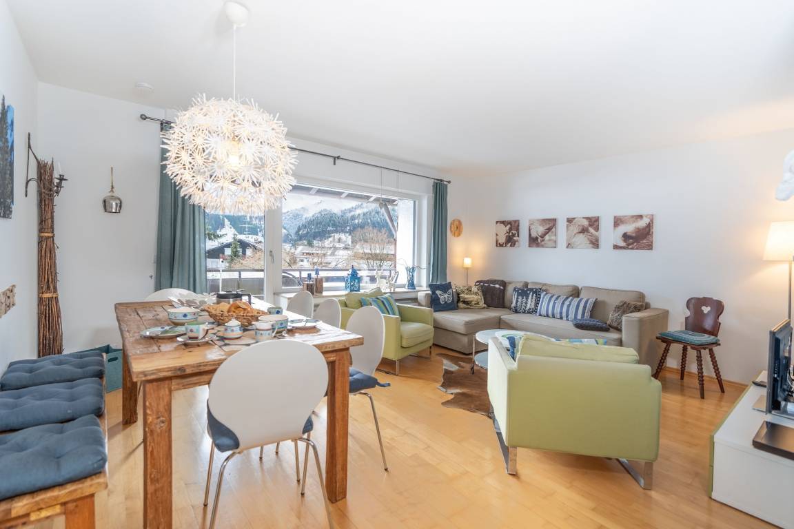 Diese gemütliche Ferienwohnung wird Ihnen gleich bei Ihrer Anreise Freude bereiten. Das helle und gemütliche Wohnzimmer ist mit Parkettboden ausgestattet, der nicht nur für gemütliche Wärme sorgt, sondern auch eine angenehme Atmosphäre schafft. Vom Wohnzimmer aus kommen Sie auf den großen Süd-Balkon, der Ihnen einen atemberaubenden Blick auf die Oberstdorfer Berge und die Hörnergruppe bietet. Hier können Sie die frische Luft genießen und die beeindruckende Landschaft bewundern. Der Essbereich mit massivem Echtholztisch bietet Ihnen ausreichend Platz für schöne Stunden. Die Küche ist komplett ausgestattet, so dass Sie die Möglichkeit haben, Mahlzeiten zuzubereiten und ihre eigenen kulinarischen Vorlieben zu genießen.