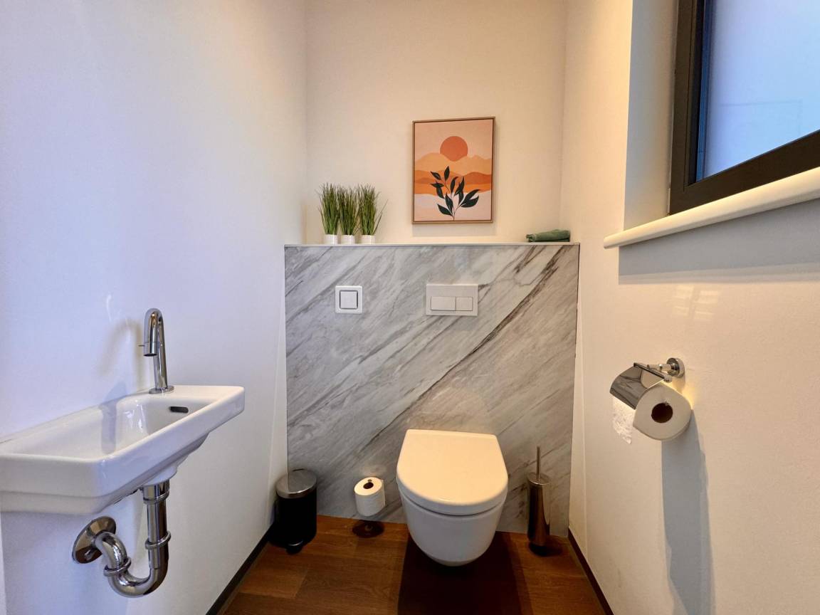 Layout : Parterre: 2x Wohnzimmer mit TV, Esstisch(6 Personen), Sitzecke , 2x offene Küche mit Kochplatte, Wasserkocher, Dunstabzugshaube, Kaffeemaschine(Filter), Backofen, Geschirrspüler, Kühl-/Gefrierkombination , 2x Toilette mit Waschbecken, Toilette , Terrasse(alleinige Nutzung), 1x Hochstuhl