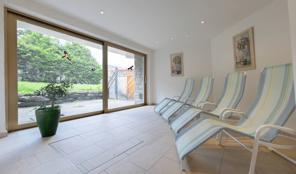 Ein Saunabereich mit finnischer Sauna, Erlebnisduschen sowie Ruheraum mit Südterrasse laden zur Entspannung ein.
