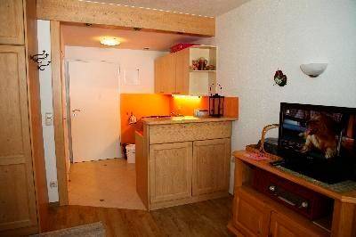 Die Wohnung ist sehr rustikal eingerichtet und strahlt eine gemütliche Atmosphäre aus. In dem großzügigen Wohnraum befinden sich eine gemütliche Sofaecke mit zwei Sesseln und einem Couchtisch, einer Essecke und einer integrierten Küche. Die Couch kann zu einem Schlafplatz umfunktioniert werden, außerdem gibt es ein Wandschrankbett. Weitere Schlafplätze gibt es im Schlafzimmer, wo sich ein Doppelbett und ein Etagenbett befinden.