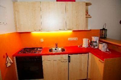 Die in den Wohnraum integrierte Küche ist unter anderem mit Herd, Backofen und Kühlschrank ausgestattet. Genießen Sie Ihre Mahlzeiten gemeinsam in der gemütlichen Sitzecke. Das Badezimmer ist mit Dusche, WC und Waschbecken ausgestattet.
