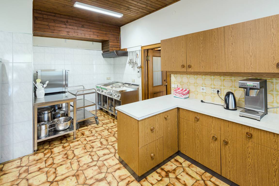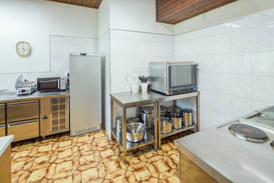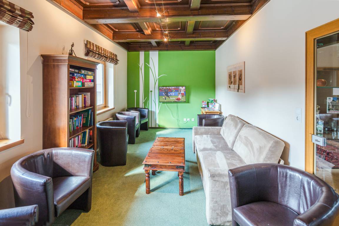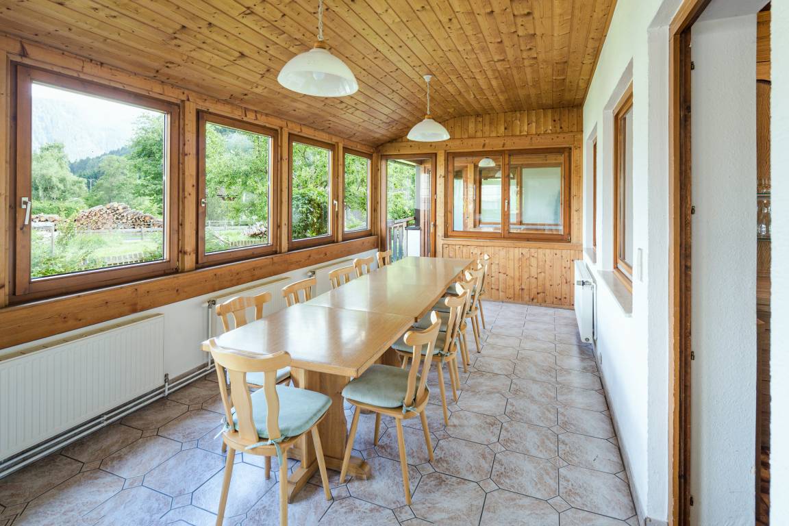 Parterre: Großer gemütlicher Wohn-/Essraum mit Esstischen, Wintergarten. Gut ausgestattete Gruppenküche mit Backofen, Mikrowelle, Aufschnittmaschine, Spülmaschine. Vorratsraum mit integriertem Kühlraum. Wohnraum mit Kabel-TV, Bücherregal, Spielesammlung.
