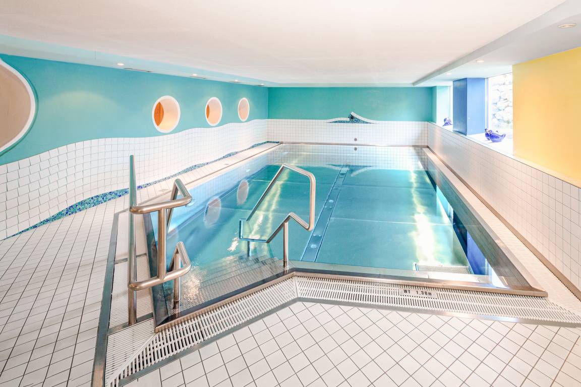 Untergeschoss: Komfortabler Wellnessbereich auf 320 qm Fläche mit beheiztem Pool (28 Grad), finnische Sauna, Bio-Sauna, Infrarot-Wärmekabine, Tepidarium, Ruheraum mit Liegen, 4 Duschen, 1 Schwalldusche, separates WC, Pissoir. Das Saunieren ist im Zeitraum 16 Uhr – 21 Uhr möglich. Spielraum mit Klettergerüst, Lego, etc.