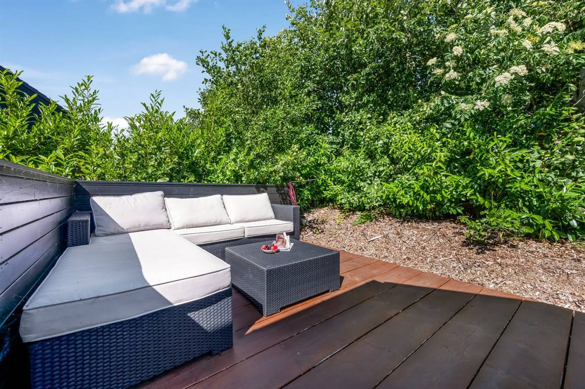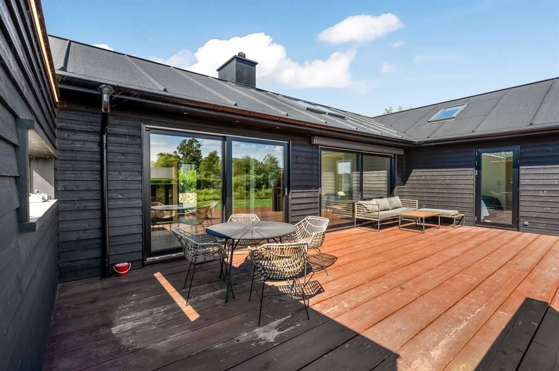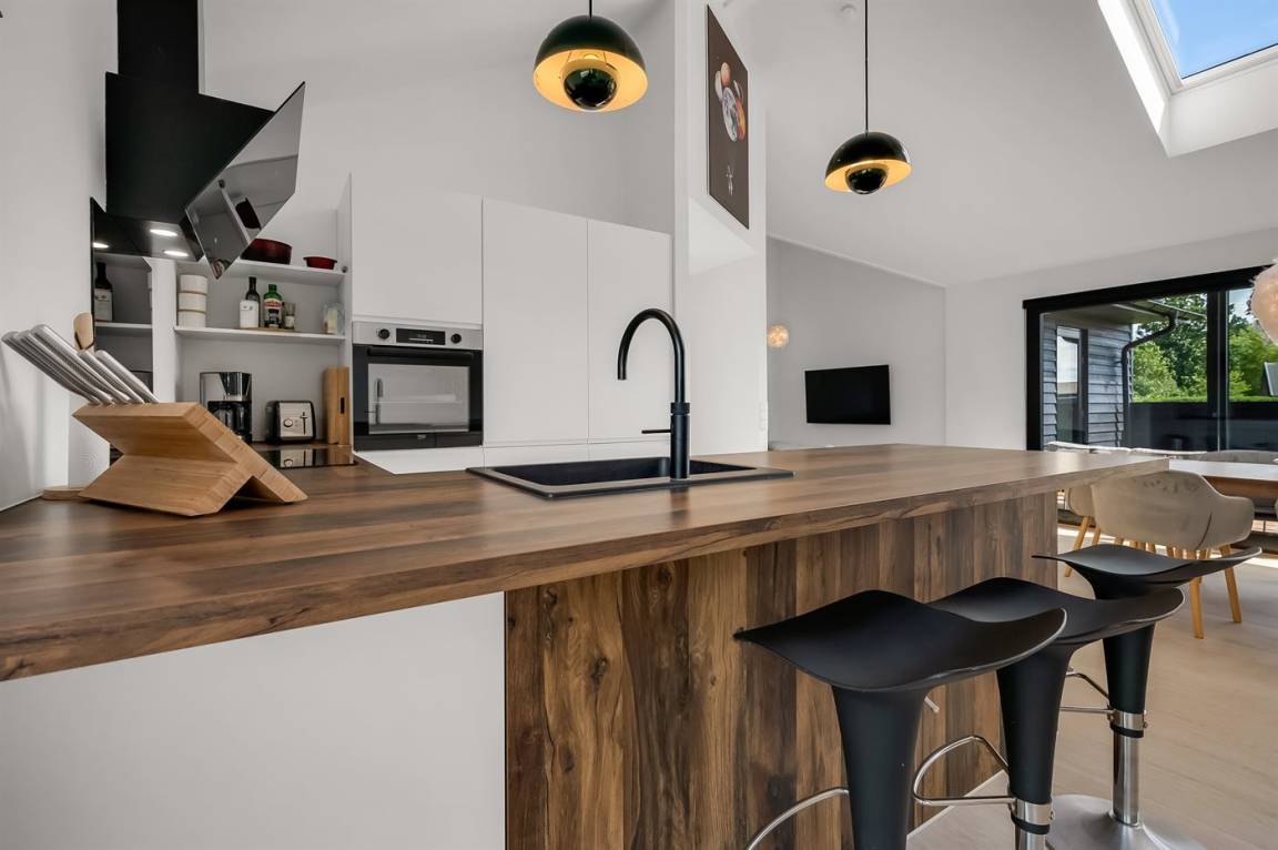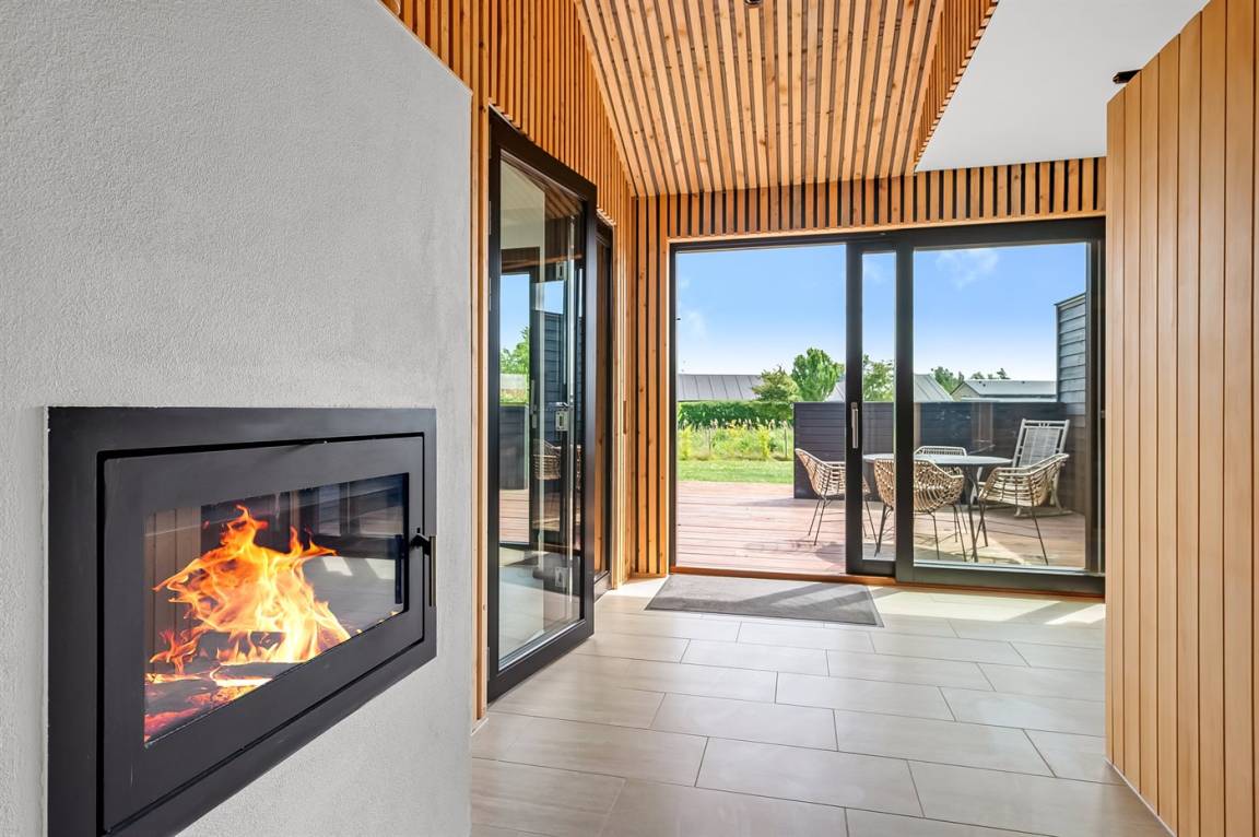 Im Inneren findest du vier Schlafzimmer mit bequemen Betten, zwei offene Obergeschossen und zwei Badezimmer sowie einen wunderbaren Wellnessbereich – also genug Platz für Familie und Freunde. Im Zentrum des Hauses liegt der helle Wohnraum mit offener Decke und Dachfenstern, die viel Tageslicht hereinlassen. Ein doppelseitiger Kamin verbindet Wohnzimmer und Wellnessbereich und sorgt an kühlen Abenden für Wärme und Gemütlichkeit.