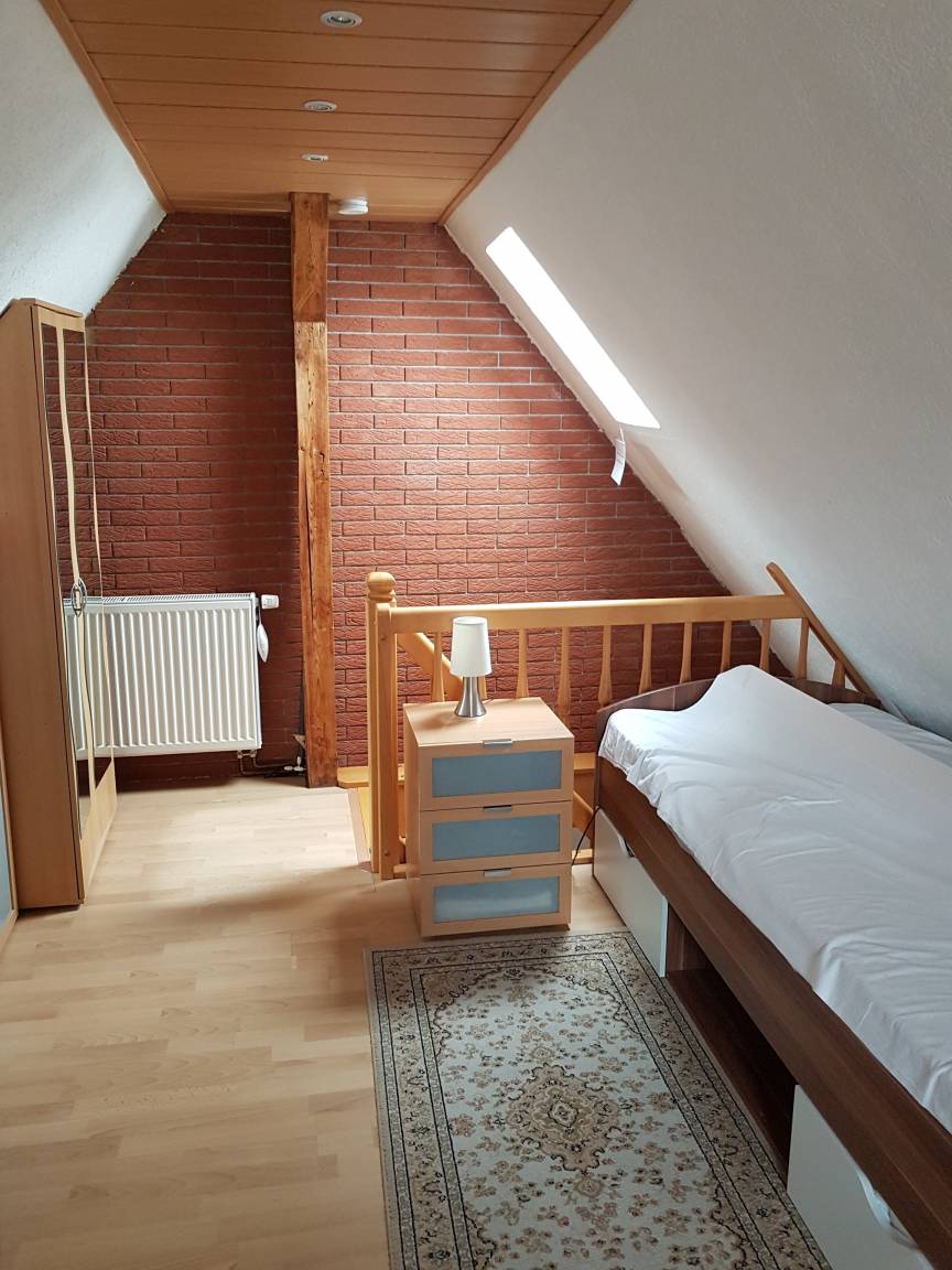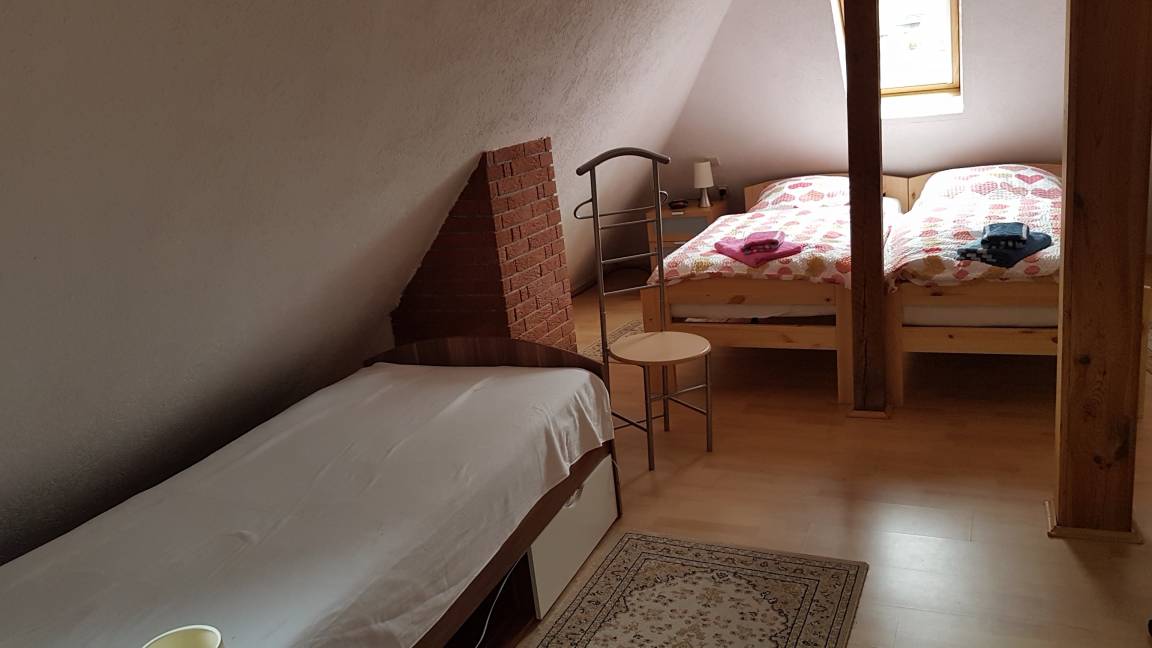 Das Schlafzimmer ist mit einem Doppelbett und einem Einzelbett ausgestattet. Das Doppelbett kann in zwei Einzelbetten umgewandelt werden. Ein Kleiderschrank mit Spiegel ist vorhanden. Das Schlafzimmer befindet sich unter dem Dach. Bei sommerlichen Temperaturen heizt sich dieser Raum natürlich etwas auf.