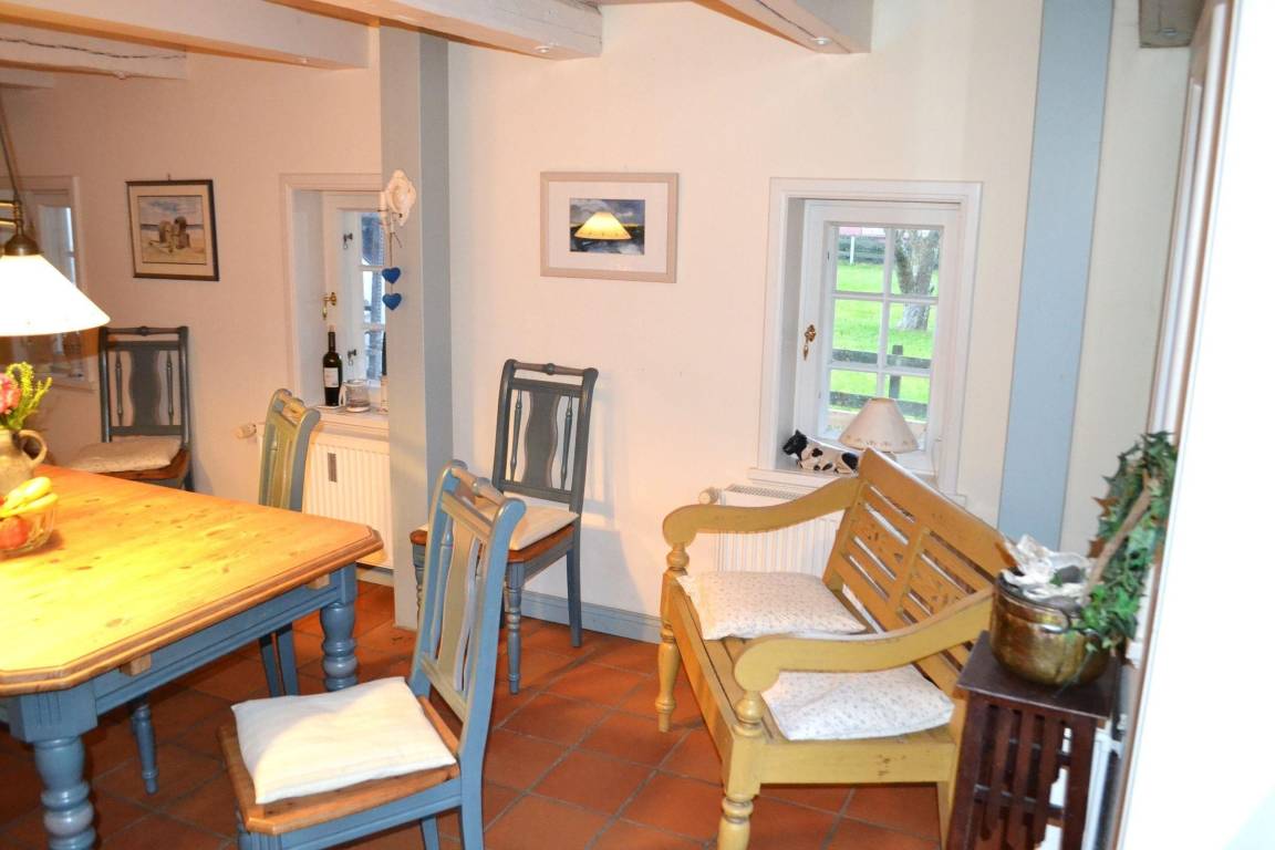 Der Außenbereich dieses charmanten Ferienhauses überzeugt mit einer großzügigen, blickgeschützten Terrasse und einem herrlichen Garten, der reichlich Platz für entspannte Stunden im Freien bietet. Gäste können die Liegewiese nutzen, um sich in der Sonne zu entspannen oder die bereitstehenden Sonnenliegen mit Auflagen zu genießen. Der Garten ist zudem mit einer Sandkiste ausgestattet, ideal für Familien mit Kindern. Die ruhige und ländliche Lage ermöglicht es, die Natur in vollen Zügen zu genießen und gleichzeitig von der Nähe zum lebhaften Wyk zu profitieren. Dieses Feriendomizil ist somit der perfekte Ort, um Erholung und Natur miteinander zu verbinden. Für Hundeliebhaber wird eine Kaution von 100,00 Euro erhoben.