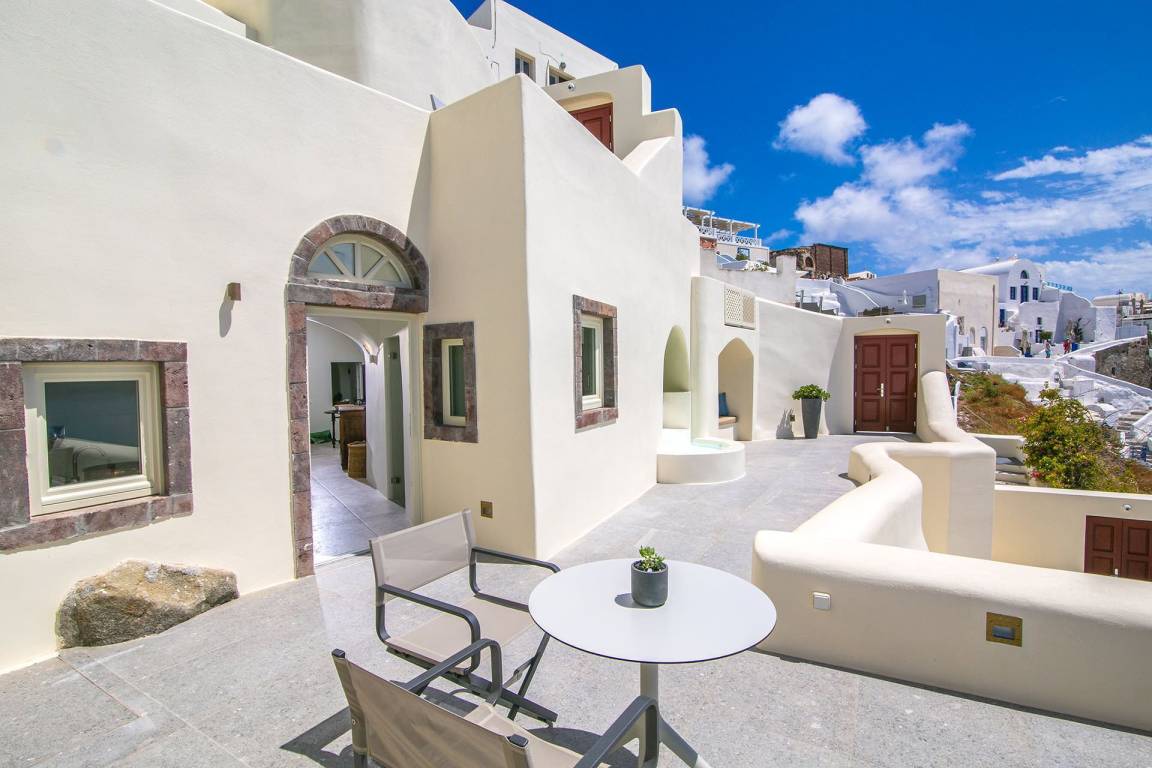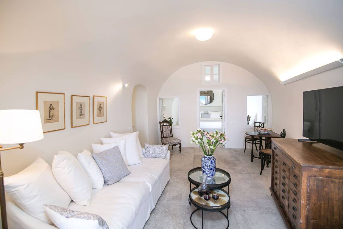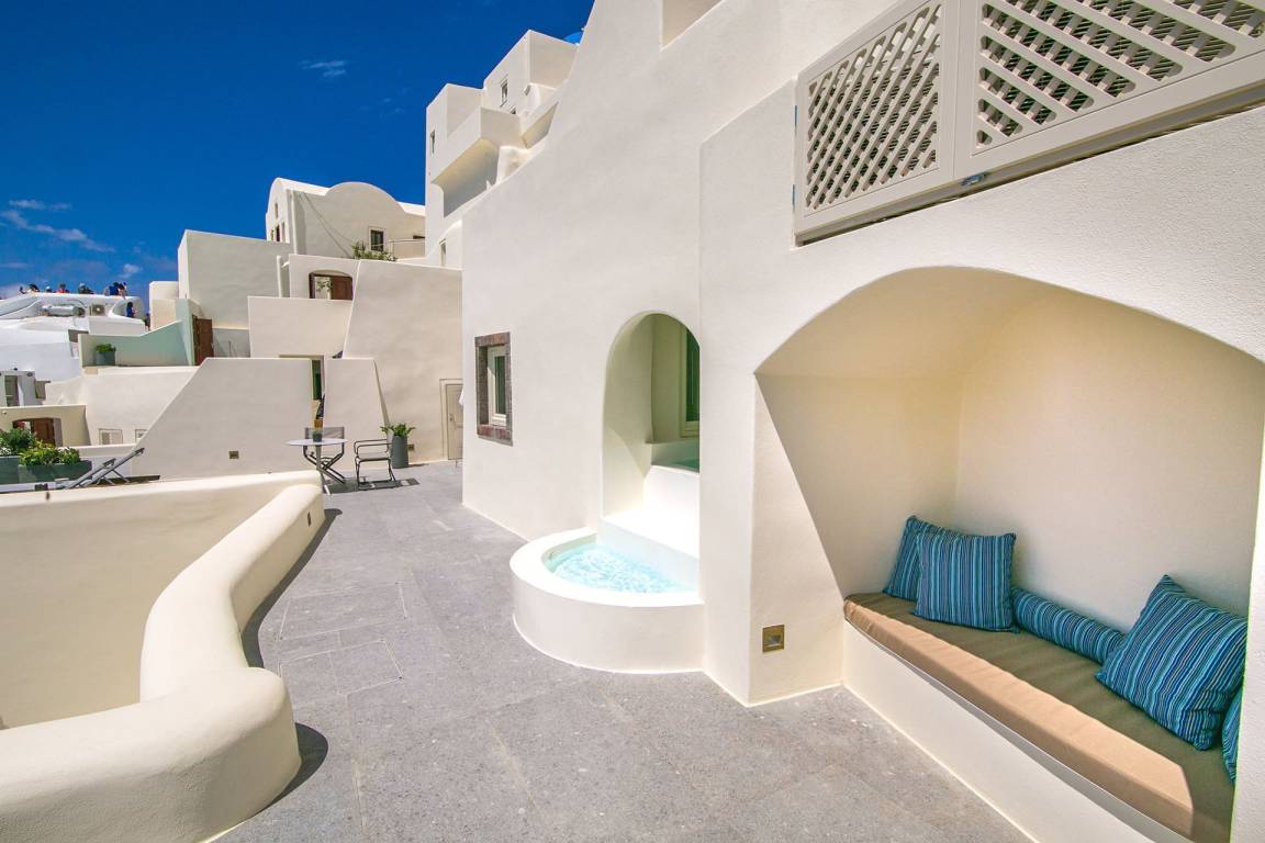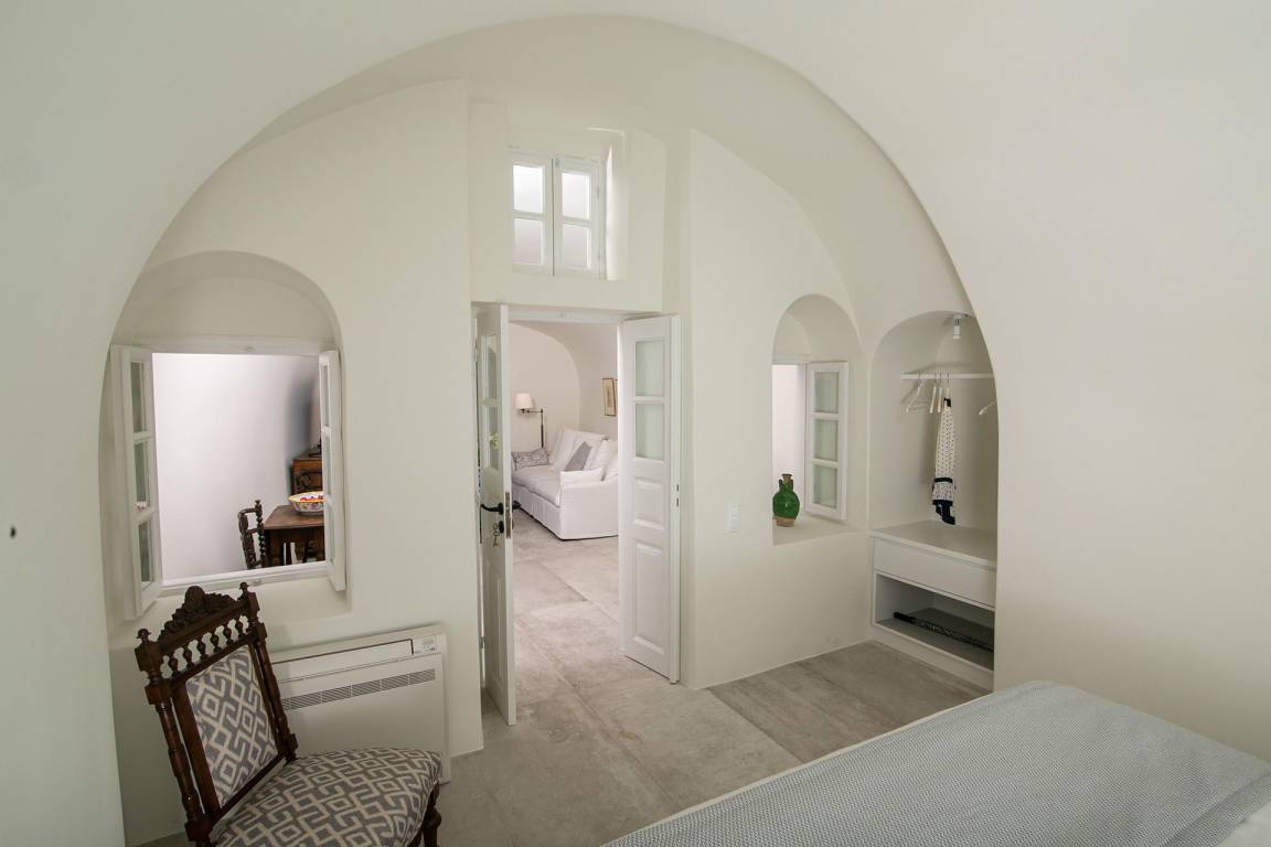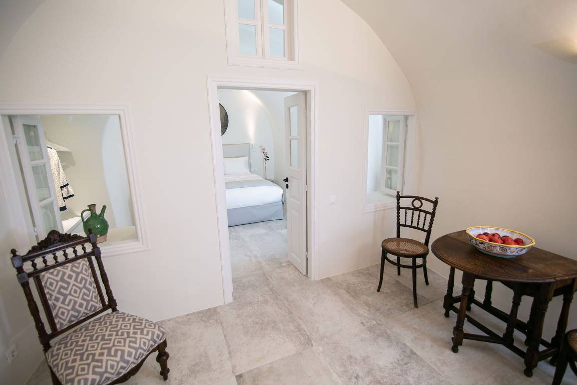 Die Volcano Suite umfasst 1 Schlafzimmer und 1 Bad mit Jacuzzi-Badewanne und bietet Platz für maximal 2 Gäste. Das Schlafzimmer ist mit einer raffinierten und intimen Atmosphäre gestaltet. Die Suite liegt innerhalb eines exklusiven Komplexes mit 8 Suiten und bietet ungestörte Ausblicke auf die Caldera von Santorini und die Vulkanlandschaft.
