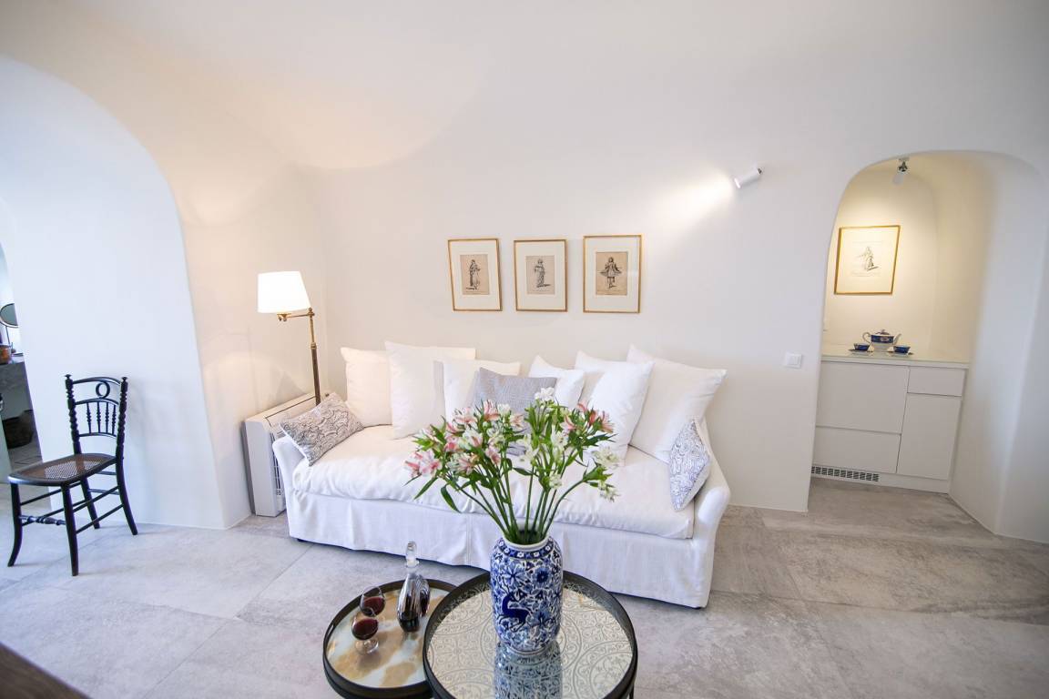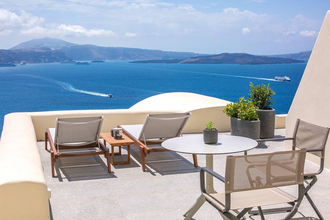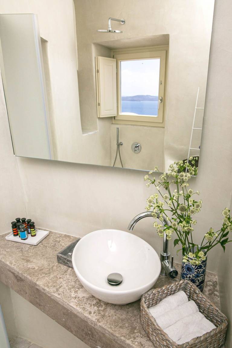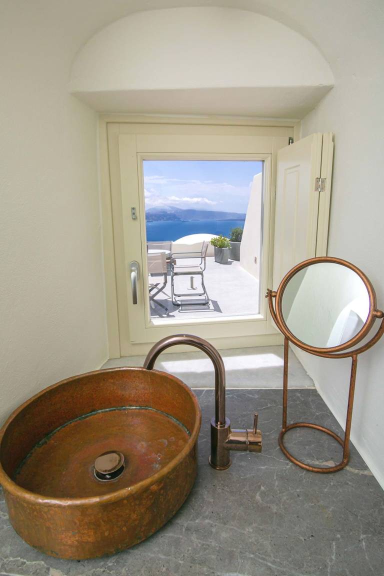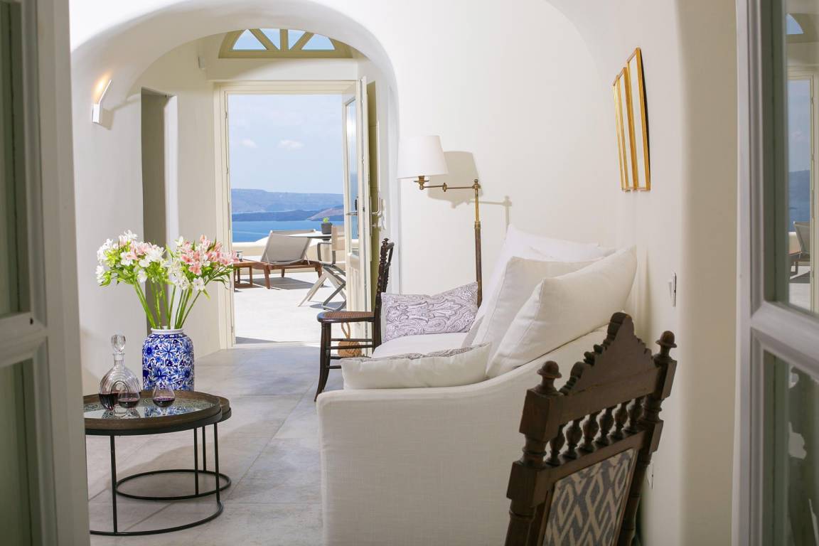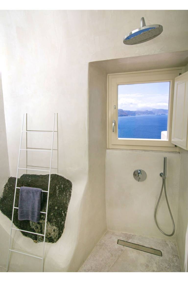 Die Volcano Suite umfasst 1 Schlafzimmer und 1 Bad mit Jacuzzi-Badewanne und bietet Platz für maximal 2 Gäste. Das Schlafzimmer ist mit einer raffinierten und intimen Atmosphäre gestaltet. Die Suite liegt innerhalb eines exklusiven Komplexes mit 8 Suiten und bietet ungestörte Ausblicke auf die Caldera von Santorini und die Vulkanlandschaft.