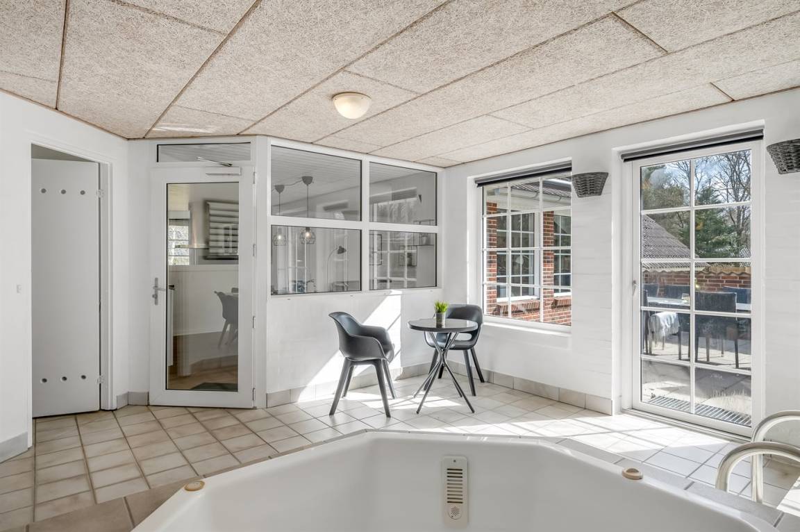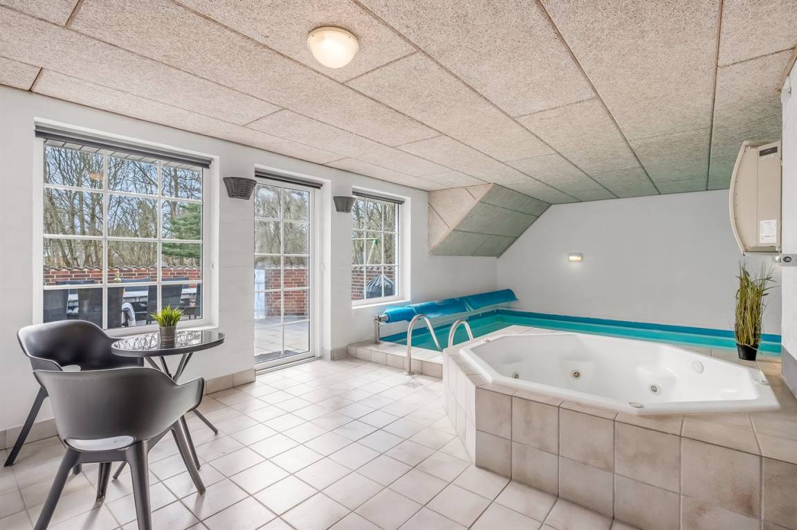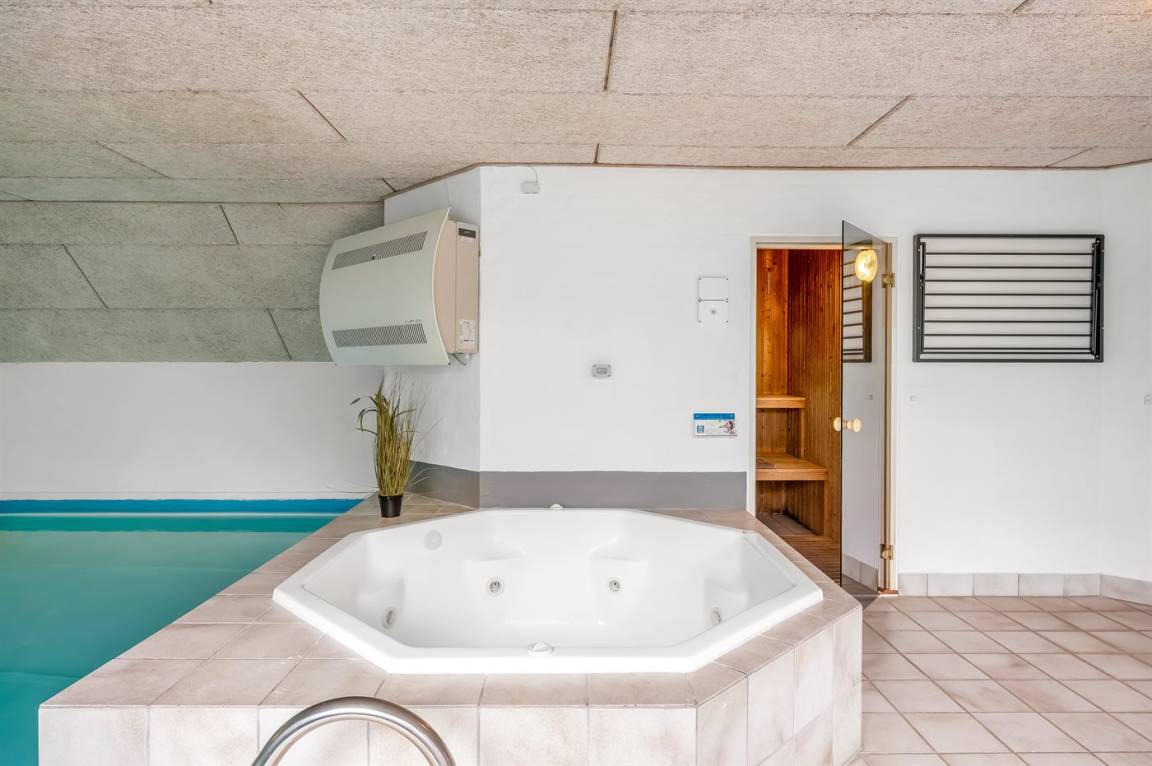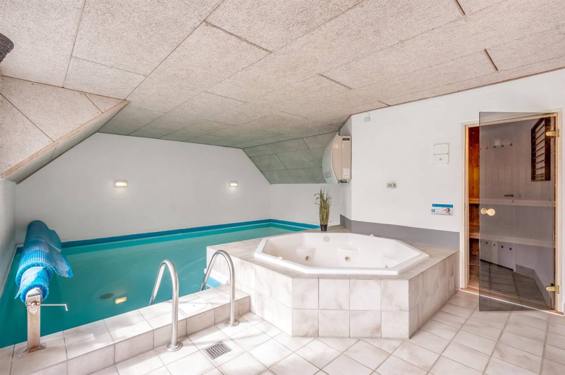Herrliche Poolabteilung mit Swimmingpool (5,9 x 4,0 x 1,3 m), integriertem Whirlpool für 4–5 Personen (Standwasser) und Badezimmer mit Duschnische und Fußbodenheizung. Zusätzlich gibt es ein schönes, weiteres Badezimmer mit Duschnische und Fußbodenheizung. Die Schlafplätze verteilen sich auf 5 Zimmer: 4 mit Doppelbett und 1 mit Etagenbett.