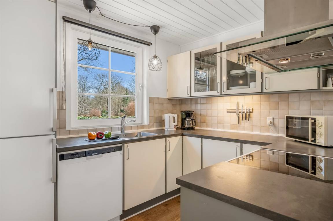 Du findest hier eine große, geschlossene und neue Terrassenfläche mit guten Gartenmöbeln, einem Außenkamin und einer Außensauna. Die Wohnküche verfügt über einen Kühlschrank, einen Umluftofen und einen Geschirrspüler aus Edelstahl, eine freihängende Dunstabzugshaube aus Stahl/Glas, einen Gefrierschrank, eine Mikrowelle sowie Induktionskochzonen.