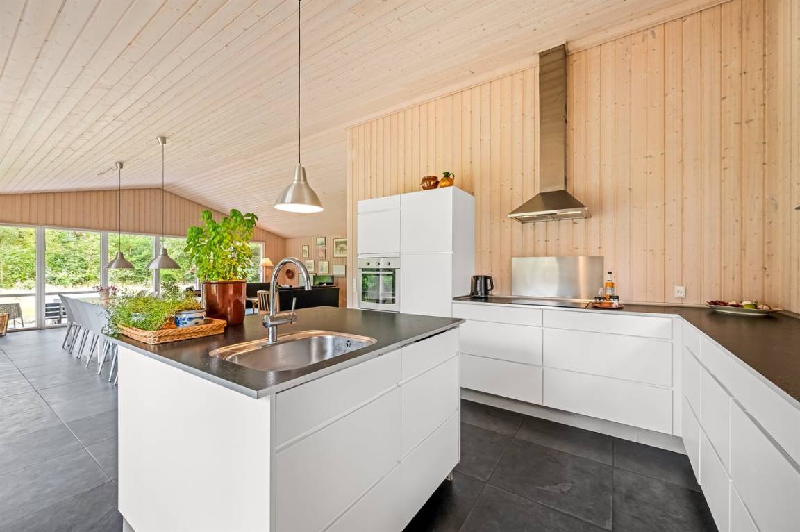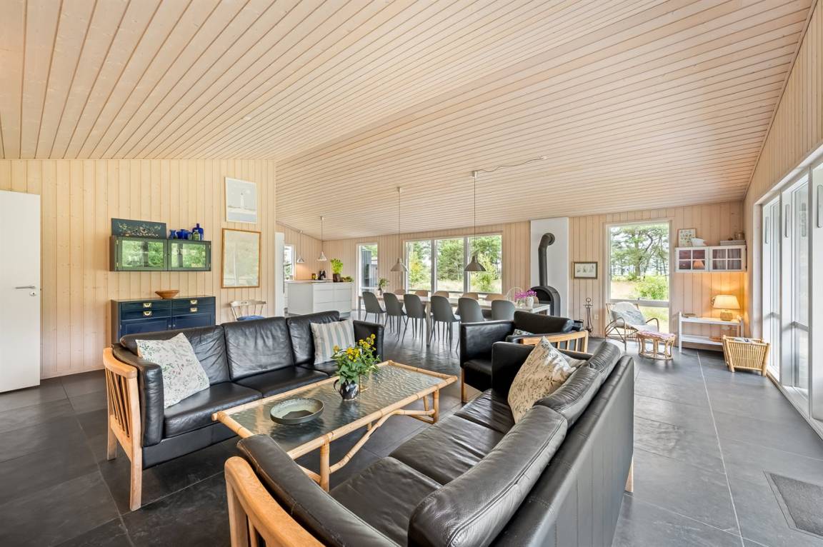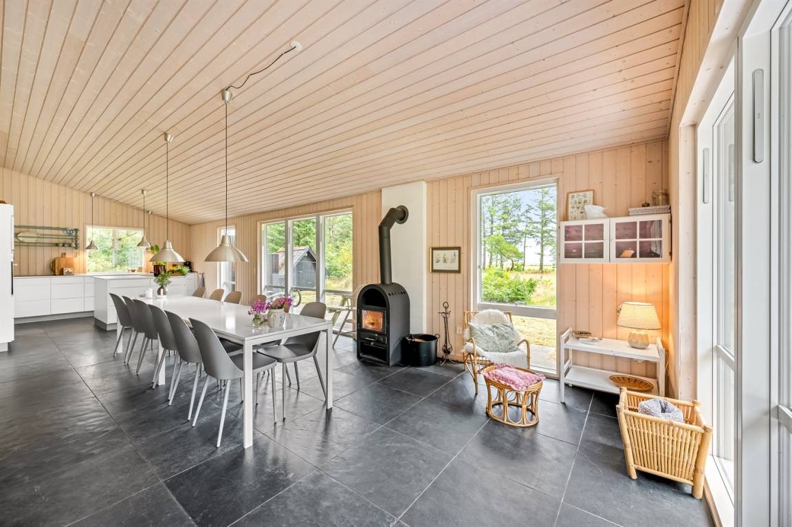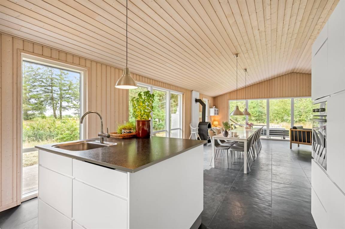 Das Ferienhaus besteht aus 2 Teilen, die durch eine Glasfront verbunden sind. Es gibt eine große, helle Küche/Esszimmer mit Zugang zu einer Terrasse.