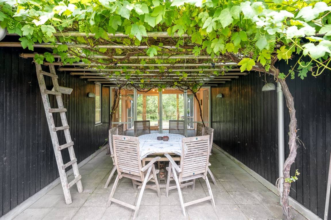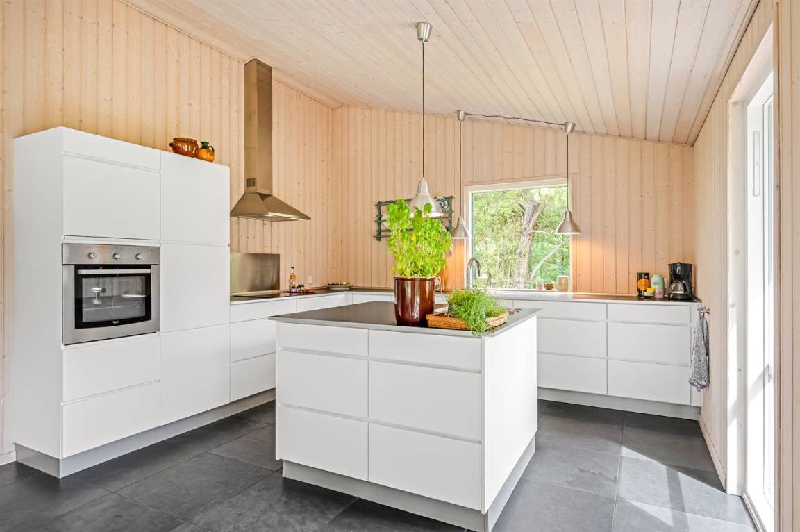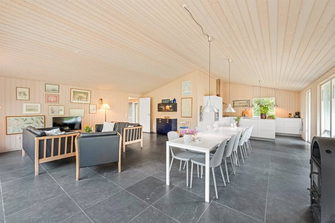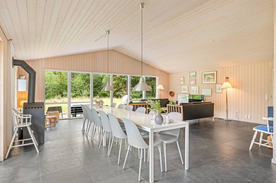 Das Ferienhaus besteht aus 2 Teilen, die durch eine Glasfront verbunden sind. Es gibt eine große, helle Küche/Esszimmer mit Zugang zu einer Terrasse.