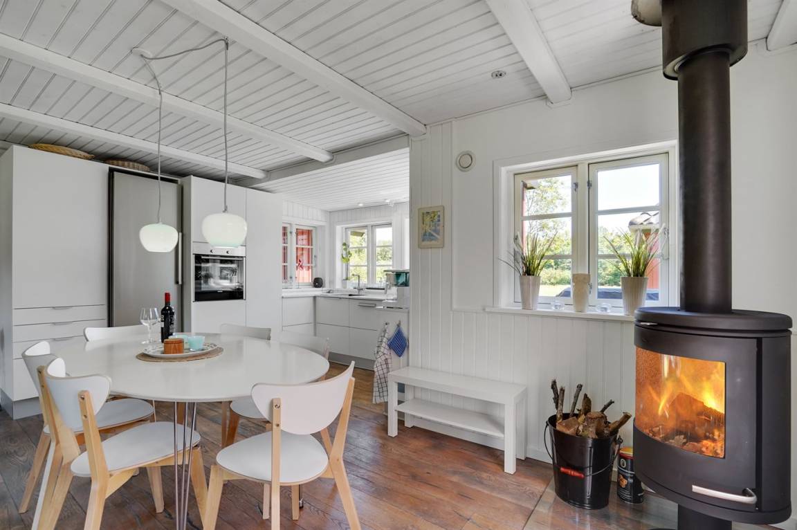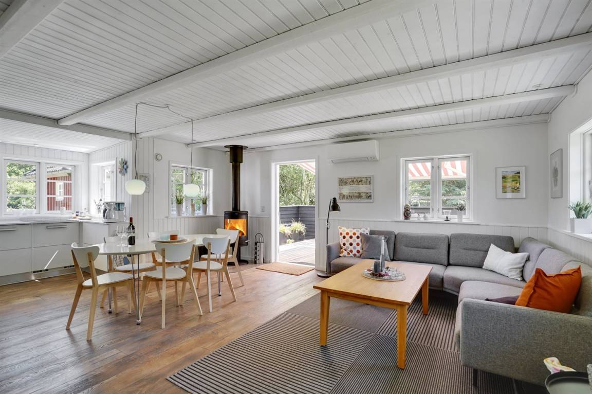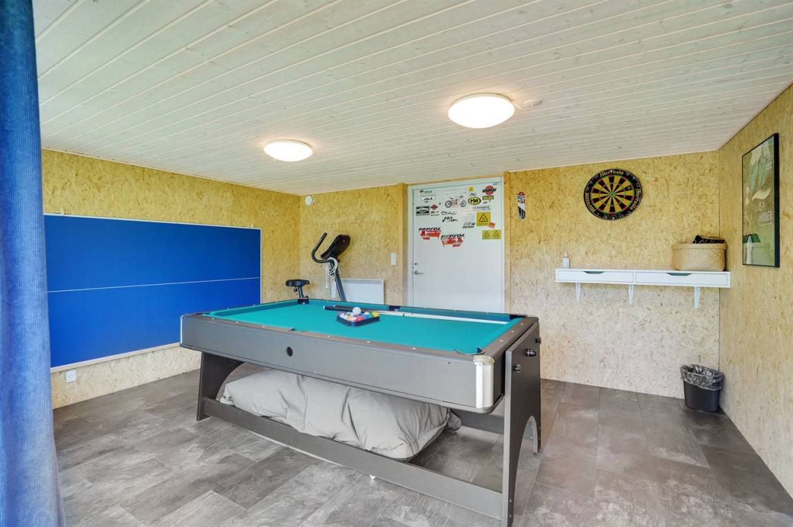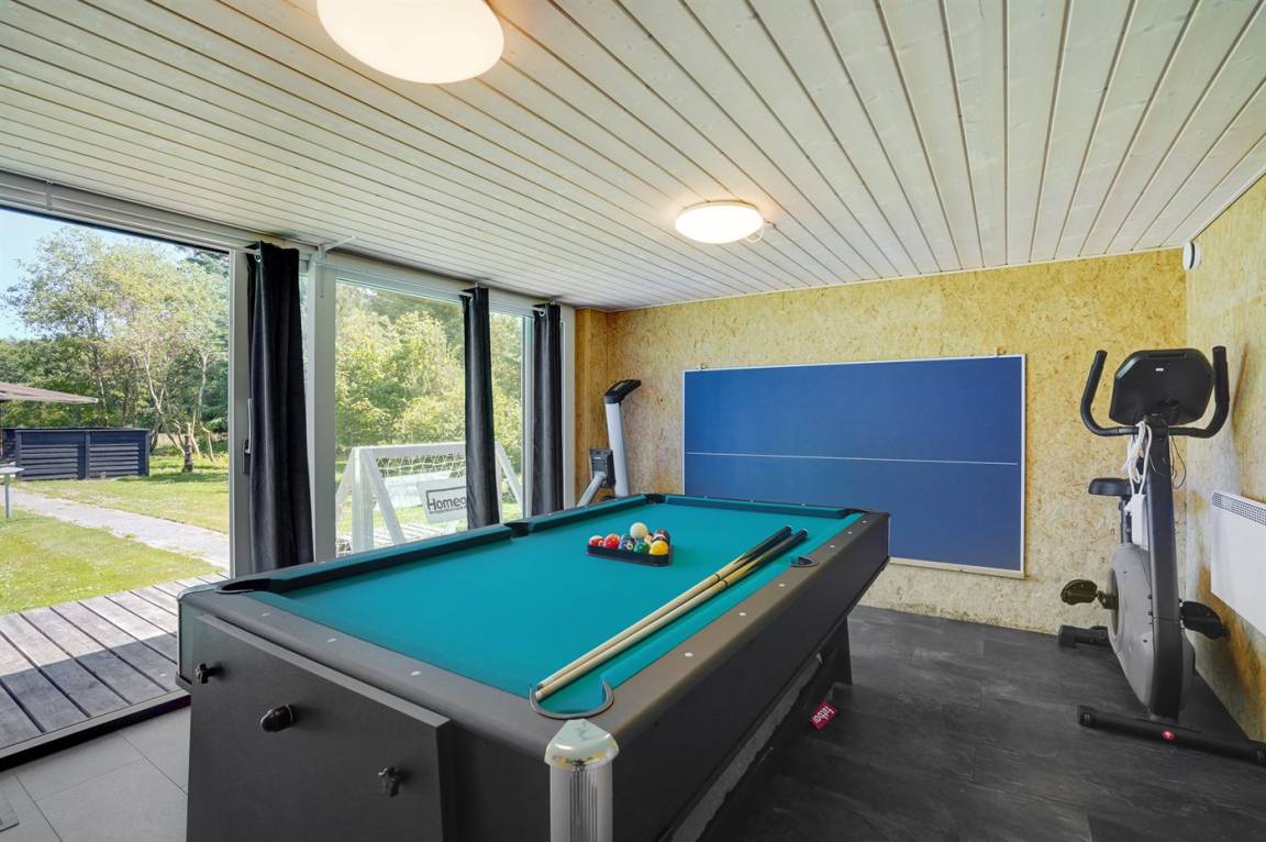In diesem schönen Ferienhaus können Sie so richtig abschalten und die Natur genießen. Das Haus liegt auf einem ungestörten Grundstück am Ende der Straße und hat einen Garten, der an ein Naturgebiet angrenzt. Am Haus gibt es auch einen Aktivitätsraum, der unter anderem mit einem wendbaren Air-Hockey-Tisch und Fitnessgeräten ausgestattet ist. Das Herzstück des Hauses ist das hübsche Wohnzimmer, wo Sie Platz und Ruhe finden, um auf dem großen Sofa Ihren Gedanken nachzuhängen, mit der ganzen Familie am Kamin zu sitzen oder einen guten Film anzusehen. Auch Bücher und Spiele stehen zur Verfügung, die Sie während Ihres Urlaubs gern nutzen können.
