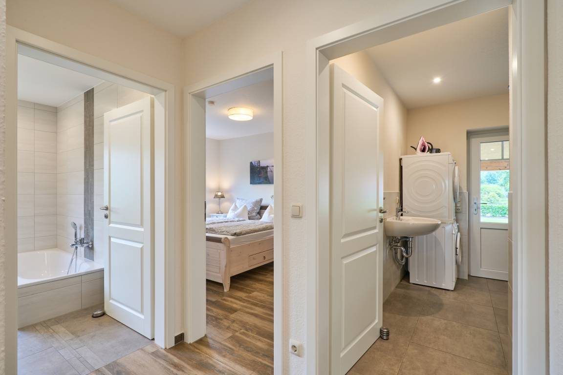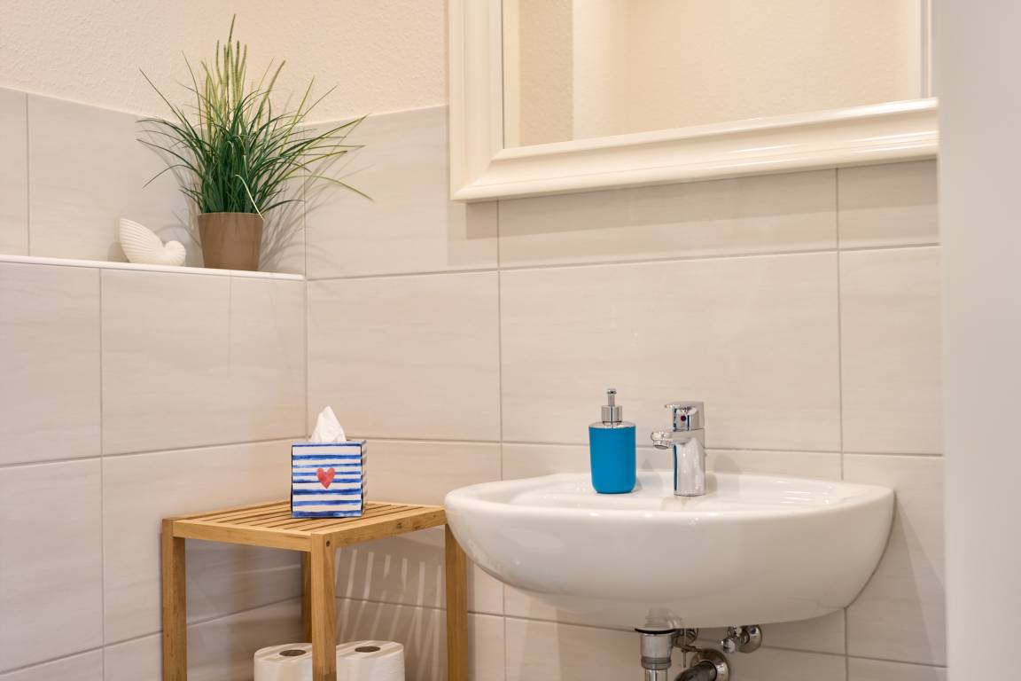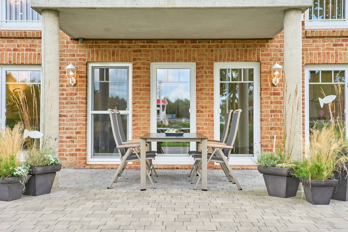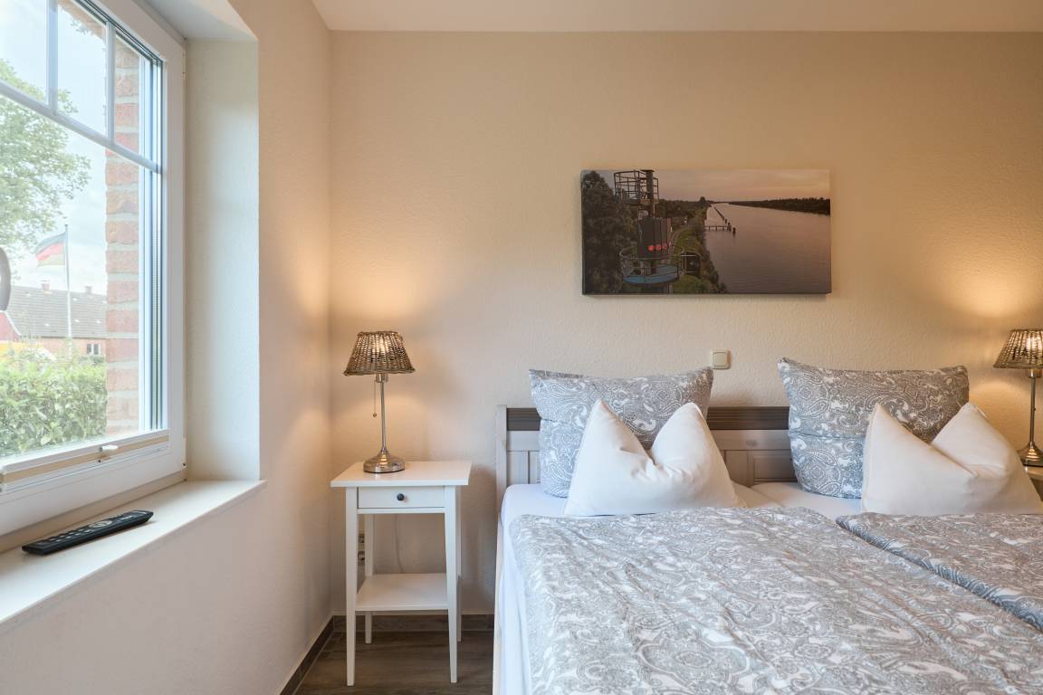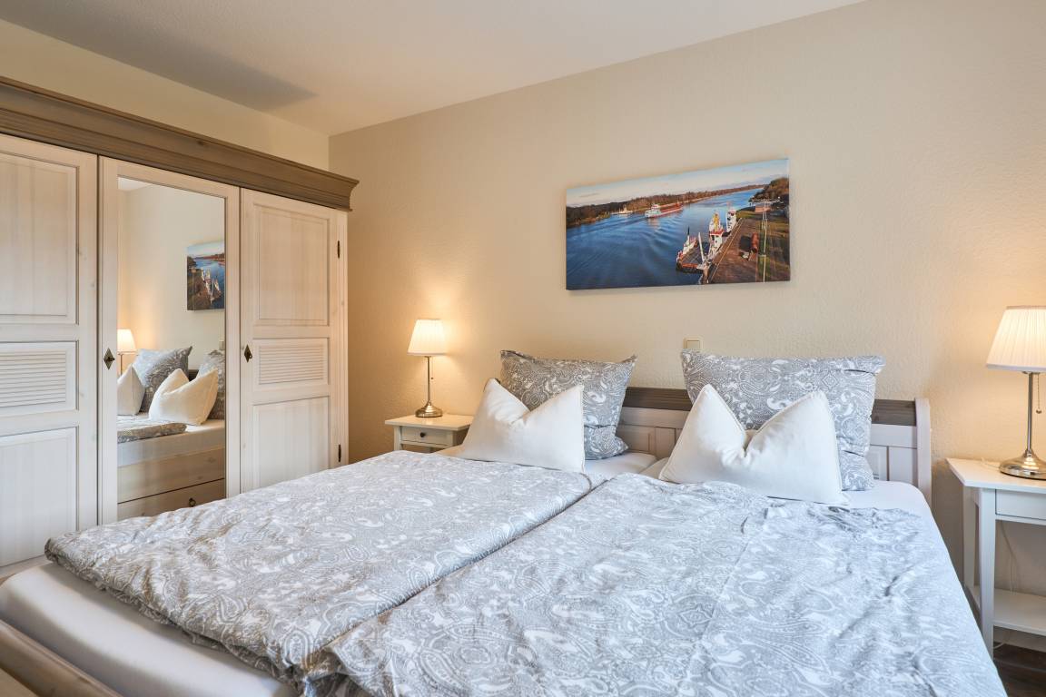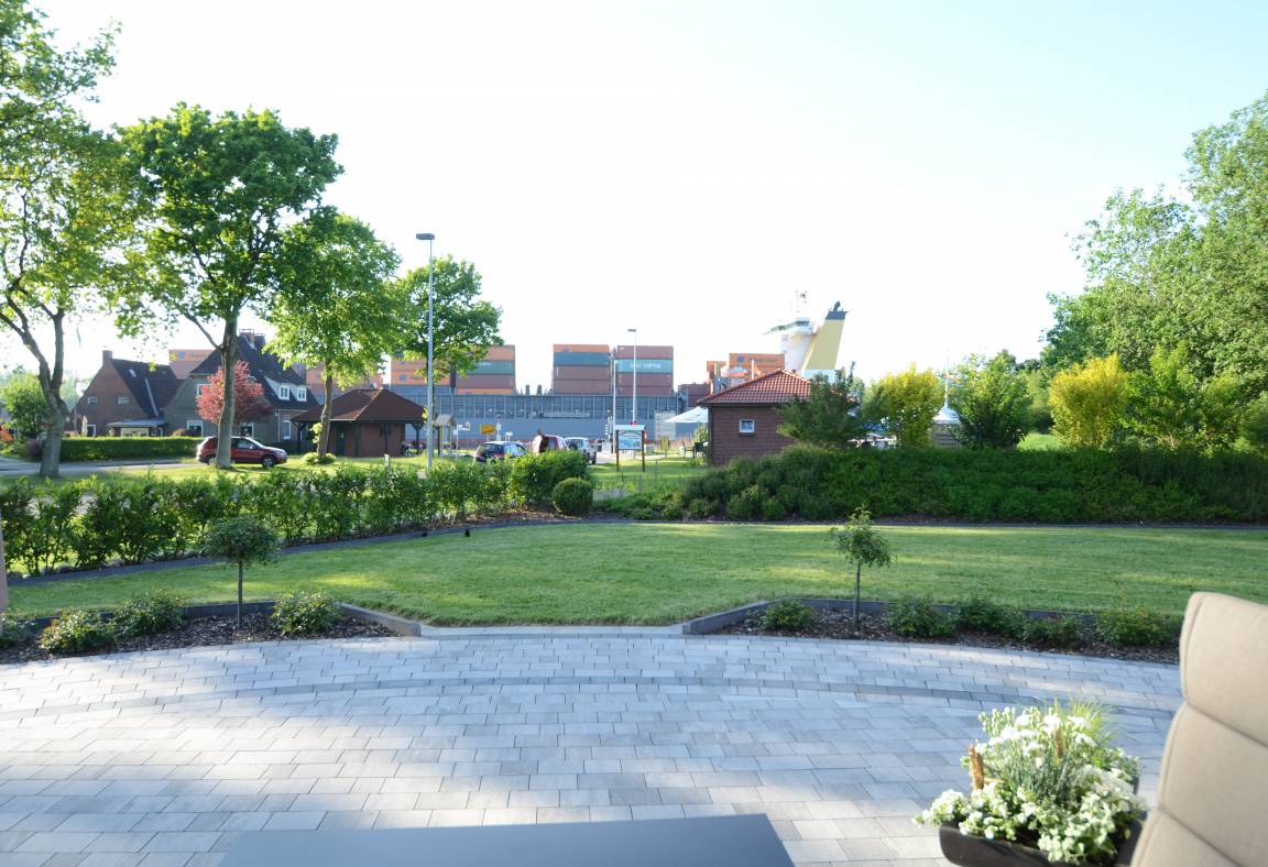 Die Ferienwohnung Schiffsdeck im Erdgeschoss ist hochwertig und geschmackvoll im hellen, modernen Landhausstil eingerichtet. In der lichtdurchfluteten Wohnung finden Sie viel Platz und Komfort für Ihren Traumurlaub. Der großzügige Schnitt der Wohnung lädt zum Erleben ein, ob gemeinsam oder lieber alleine, hier genießen Sie viel Freiraum, aber auch individuelle Rückzugsorte. Auf der großen Sonnenterrasse, die direkt vom Wohn- und Essbereich begehbar ist, finden Sie hochwertige Gartenmöbeln, einen Weber Gasgrill und natürlich einen Sonnenschirm. Der Garten mit viel Rasenfläche ist ideal für Familien mit Kindern. Die Wohnung ist bedingt barrierefrei, auf Wunsch steht Ihnen ein mobile Rollstuhlrampe zur Verfügung. Von der Nebeneingangstür zusätzlich zum Haupteingang könne Sie die Wohnung direkt vom Carport aus betreten. Zwei geräumige Schlafzimmer (Doppelbett 180x200) mit TV laden hier nach einem tollen Urlaubstag zum Träumen ein. Die Schlafzimmer haben zusätzlich zu den Plissees elektrische Aussenrollläden, damit Sie auch im Sommer nicht auf einen erholsamen Schlaf verzichten müssen. Der Wohn- und Essbereich bietet mit seinen bodentiefen Fenstern einen herrlichen Blick auf den NOK. Träumen Sie beim Kochen in der hochwertig ausgestatteten Küche von großen Pötten und der weiten Welt oder genießen Sie von der großen Wohnlandschaft das ständige pendeln der Fähre. Die Wohnung ist komplett ausgestattet, neben dem 55 Zoll TV mit DVD Player und Sonoro Soundsystem, im Wohnbereich, finden Sie eine feine Auswahl an Lektüren und Spielen. Unsere kleinen Gäste liegen uns sehr am Herzen, für sie stellen wir Ihnen gerne unsere Kleinkindausstattung zur Verfügung. Genießen Sie entspannte Sonnentage in der sehr gepflegten Gartenanlage mit viel Platz zum relaxen, Kraft tanken, entspannen oder toben und spielen. Staunen Sie über die vorbeiziehenden Schiffe oder beobachten Sie das rege Treiben der NOK- Fähre.