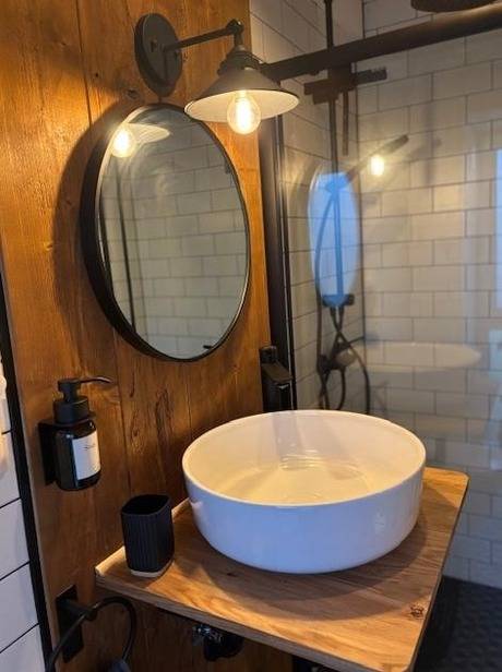 Das Badezimmer im Industrial-Style ist modern gestaltet und verfügt über eine großzügige, ebenerdige Dusche.
