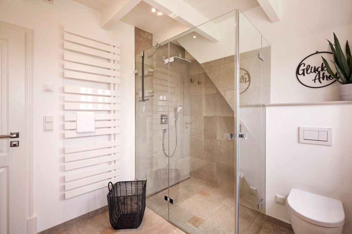 Ein Glaskamin sorgt im Wohnbereich auch an kühleren Tagen für eine gemütliche Atmosphäre. Die beiden Schlafräume befinden sich - neben dem Duschbad - im Obergeschoss des Hauses.