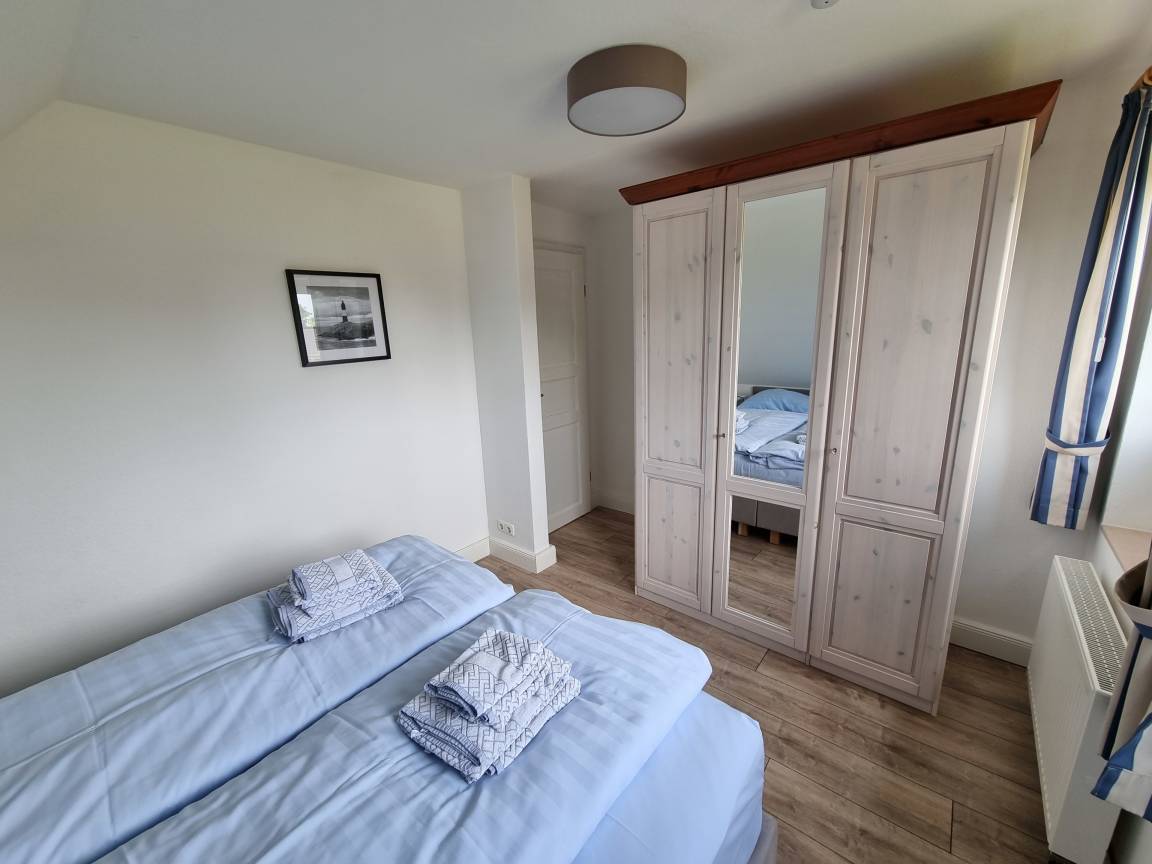 Das Schlafzimmer verfügt über ein Doppelbett mit offenem Fußende sowie einen Kleiderschrank.