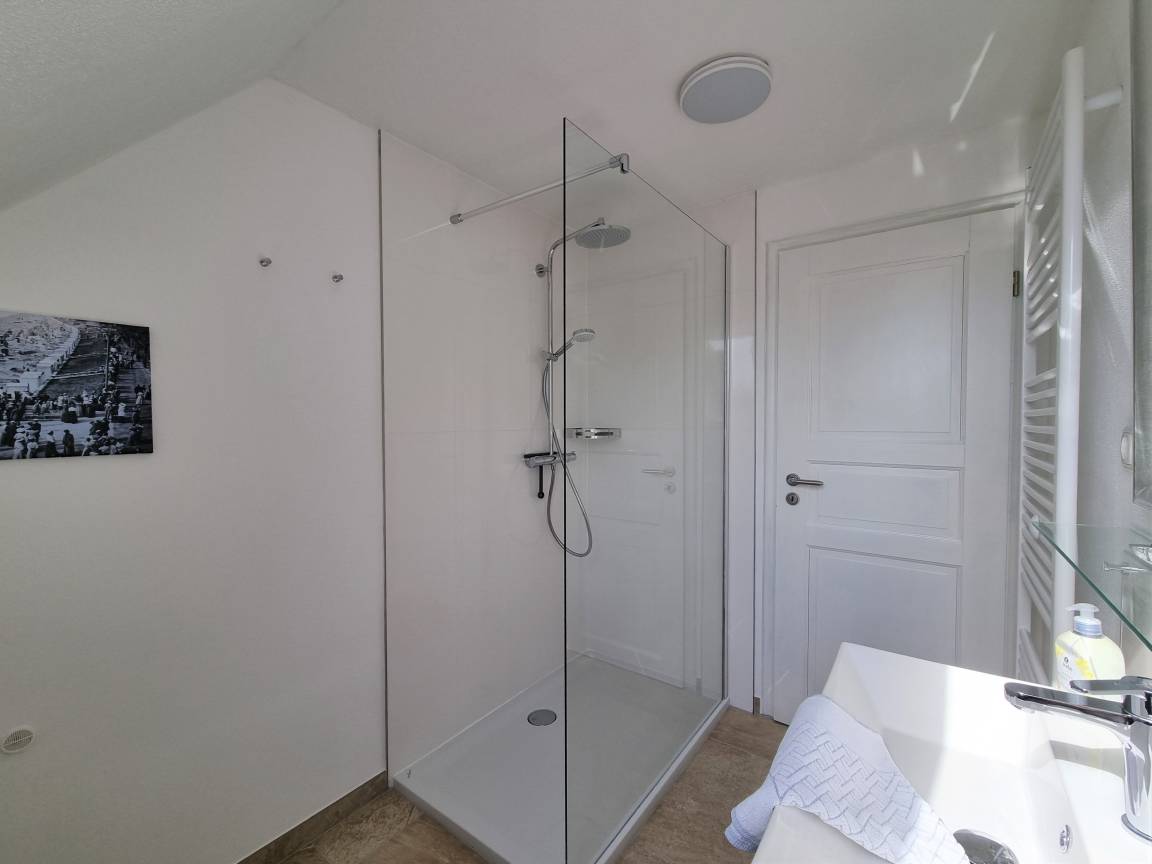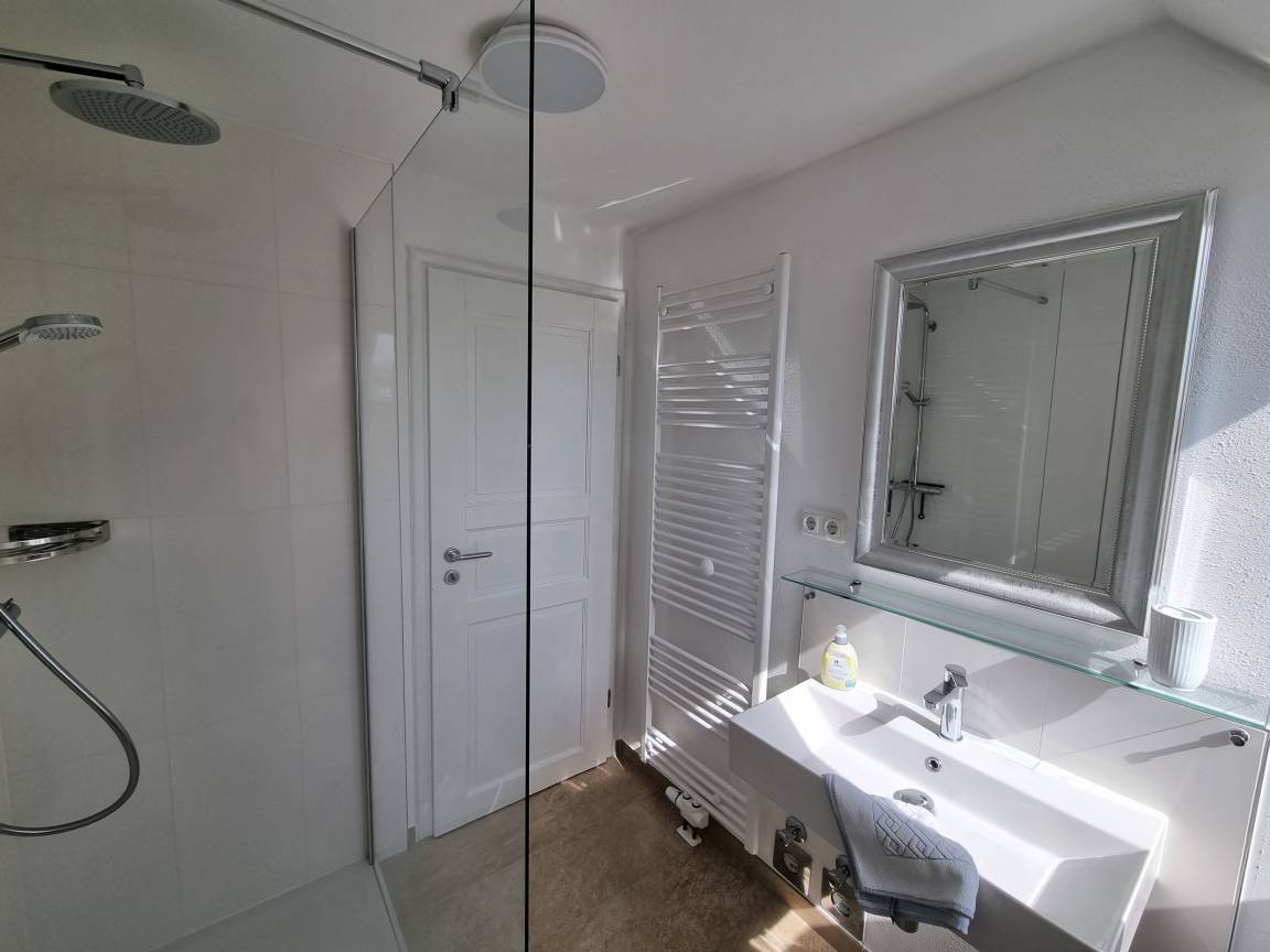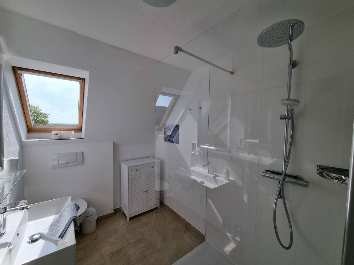 Das Badezimmer ist mit WC, Dusche und Waschbecken ausgestattet.