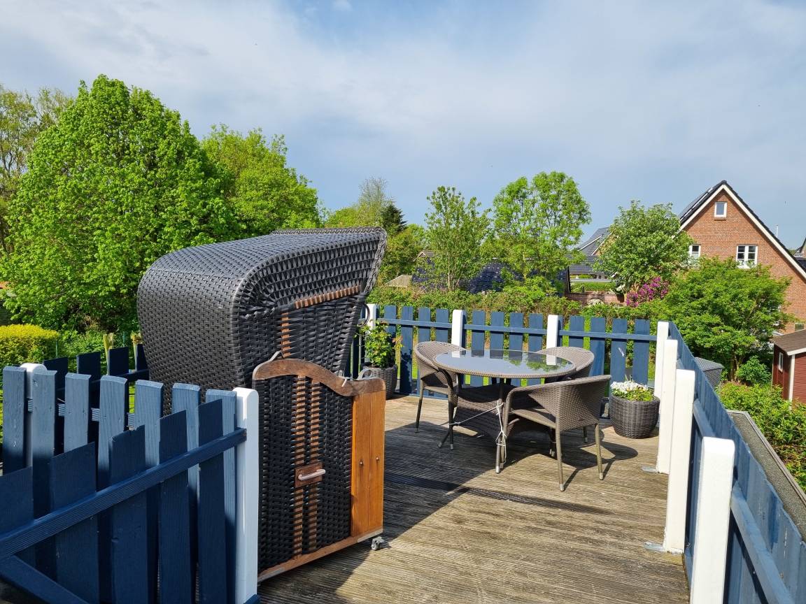 Liebevoll eingerichtete Ferienwohnung "Ockes Koje" im Fluken-Hüüs auf Föhr. Die gemütliche Wohnung im 1. Obergeschoss bietet auf 43 qm Platz für bis zu 3 Personen, ist hundefreundlich und verfügt über eine großzügige Dachterrasse.