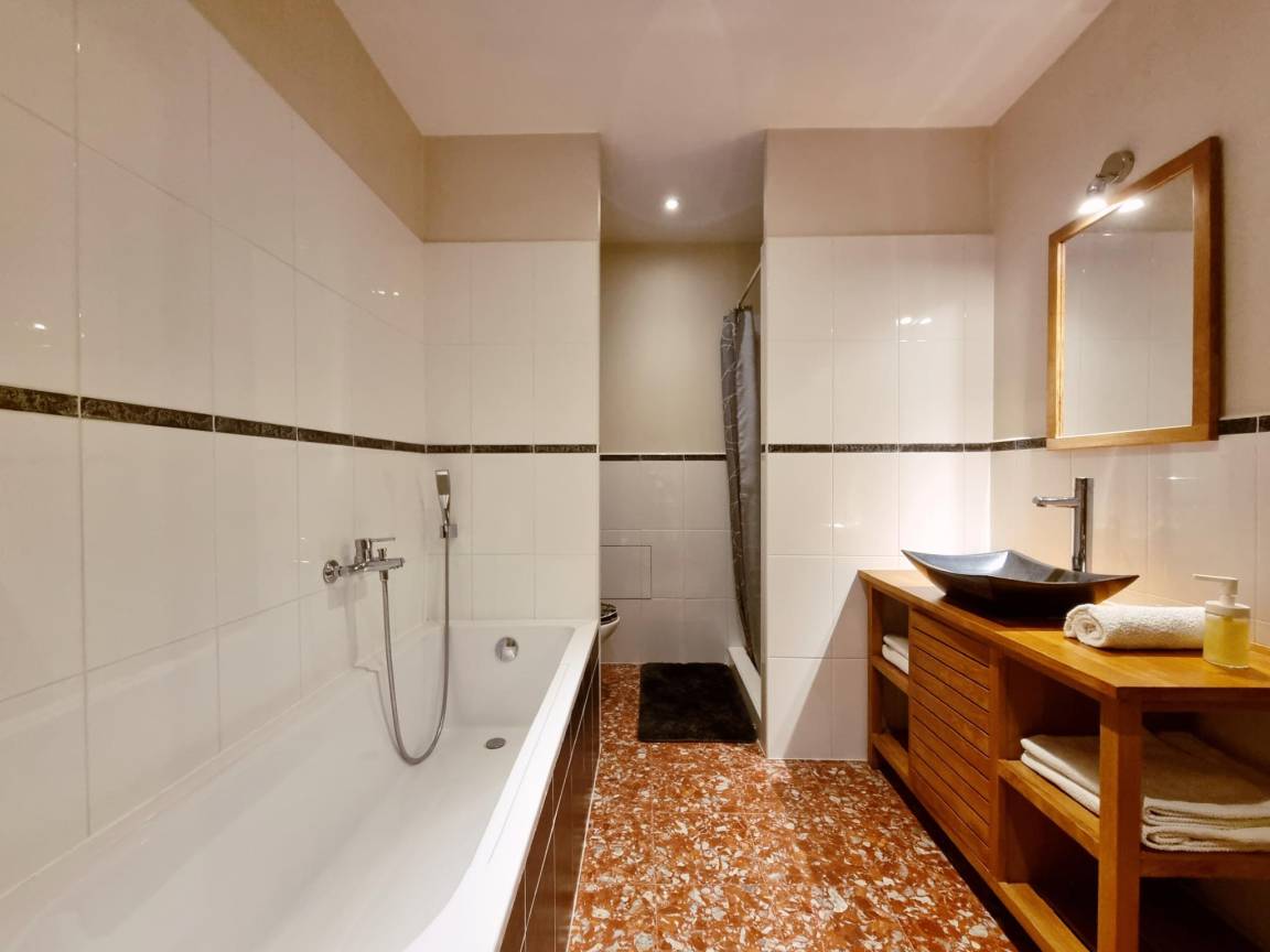 In der 2. Etage: Schlafzimmer mit Badezimmer mit Doppelbett, Badewanne, Dusche, Waschbecken, Toilette, Klimaanlage