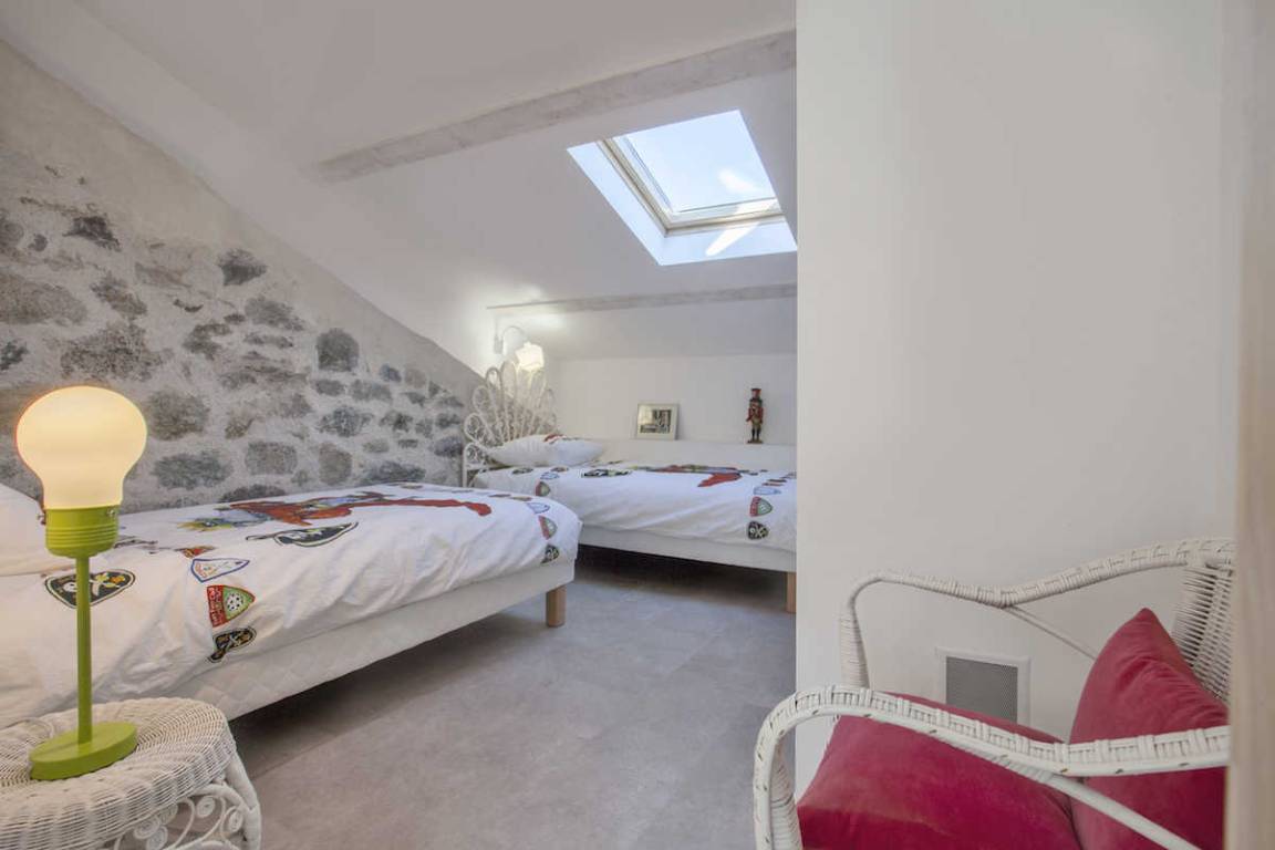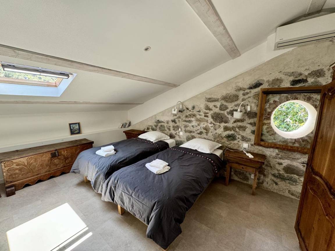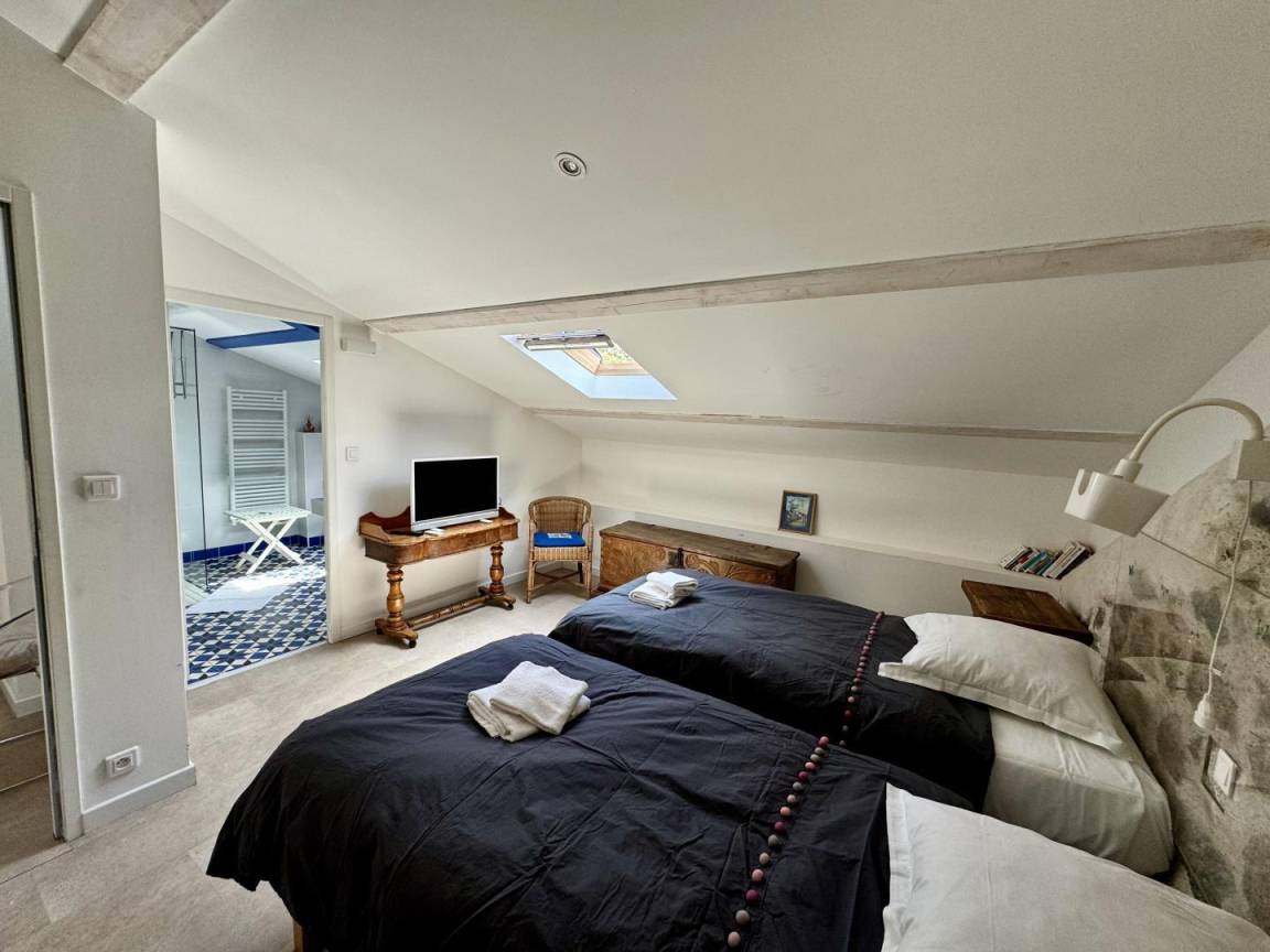 - 1 Schlafzimmer mit 2 Betten 90x200 cm, die zusammengestellt werden können, und einem Bett 90x200 cm in einem Raum mit Verbindungstür, mit eigenem Bad/WC.
