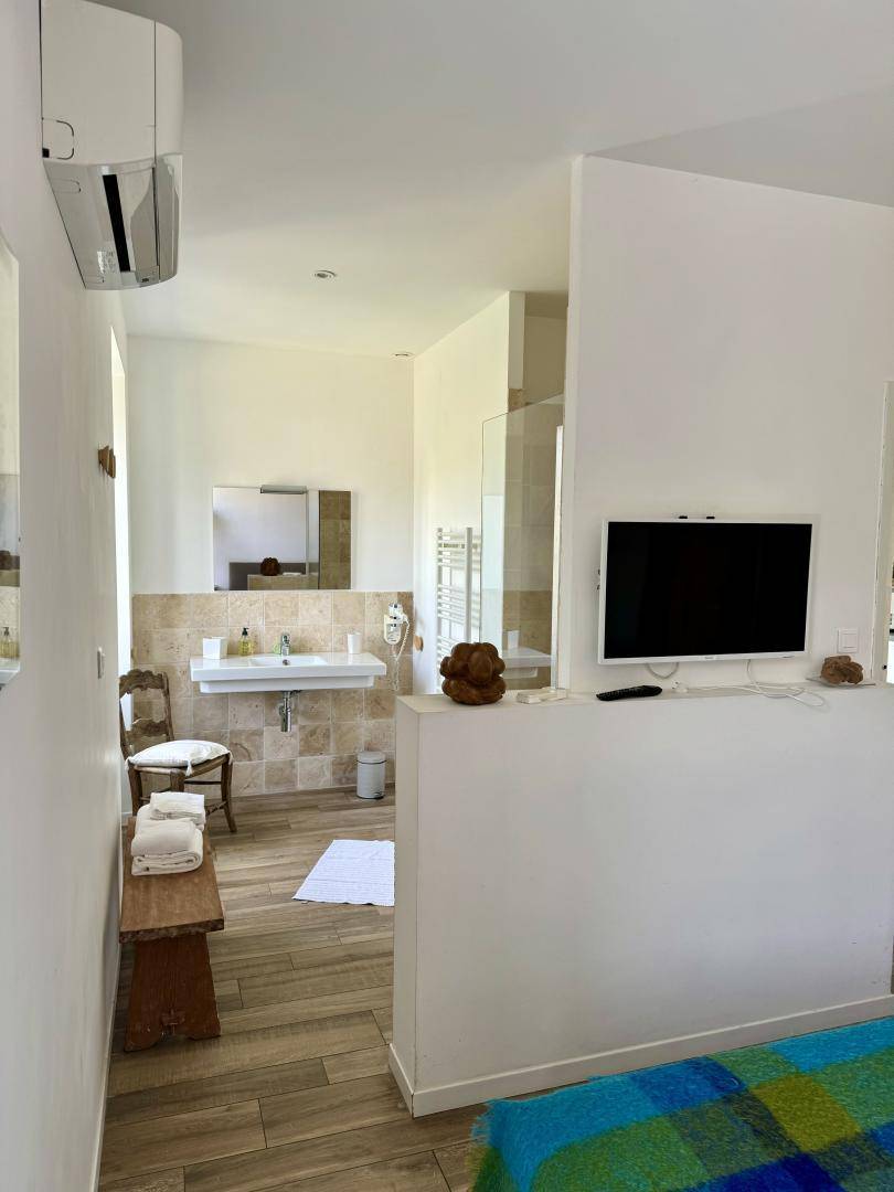 - 1 Schlafzimmer mit einem Bett 160x200 cm mit offenem Badezimmer.