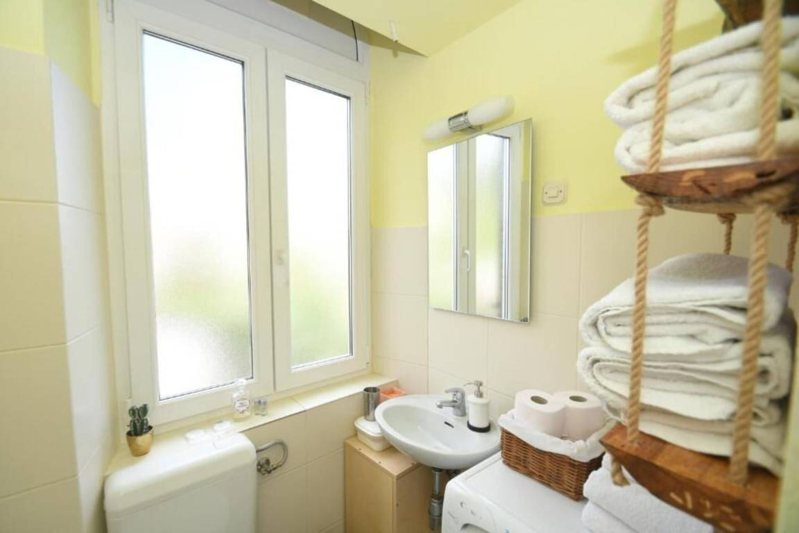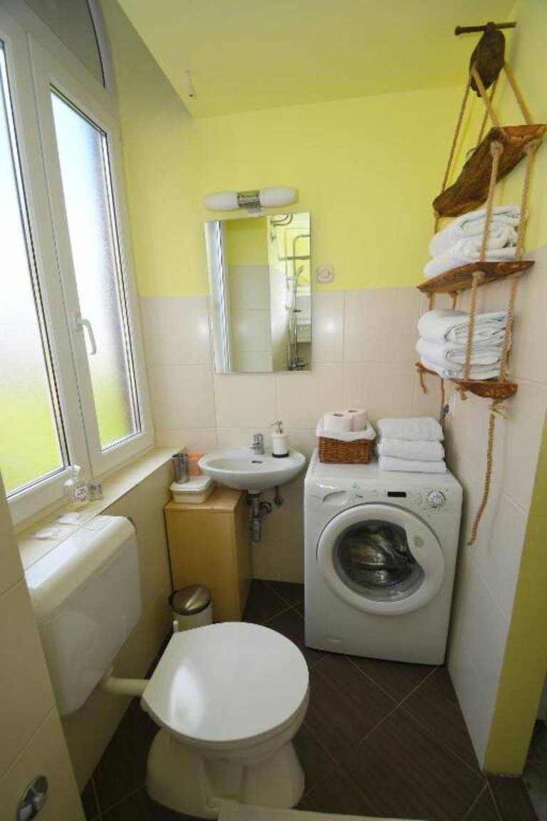 Badezimmer: Waschbecken, WC, Dusche, Waschmaschine, WiFi Internet.