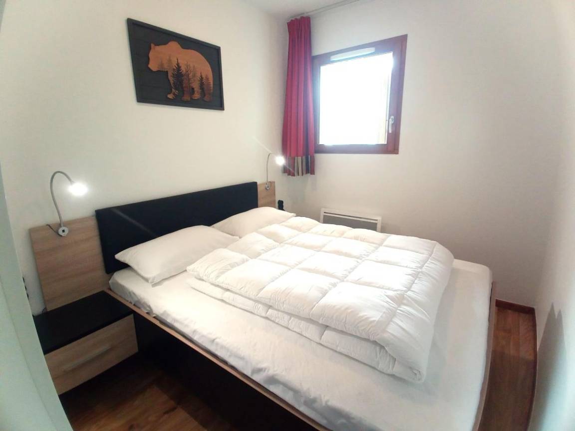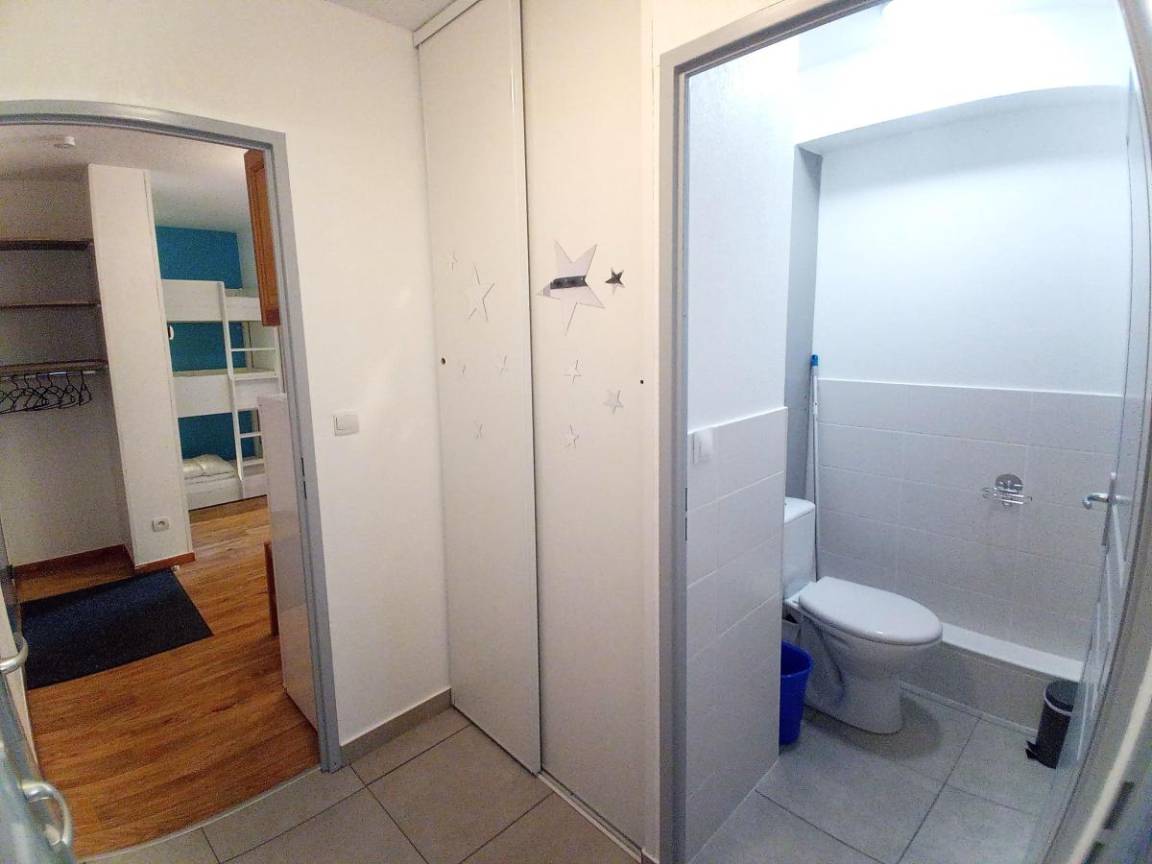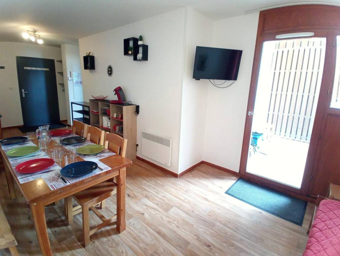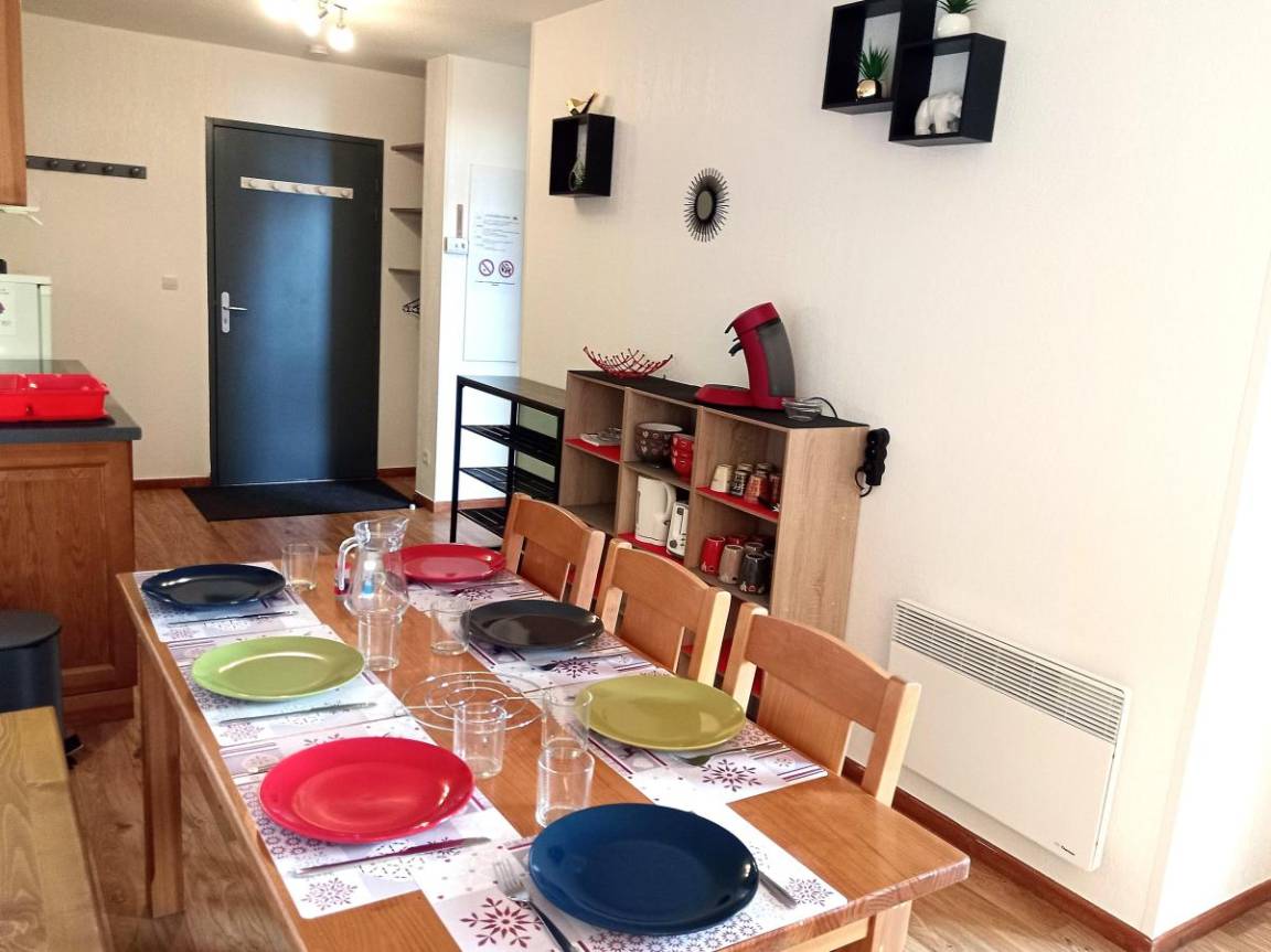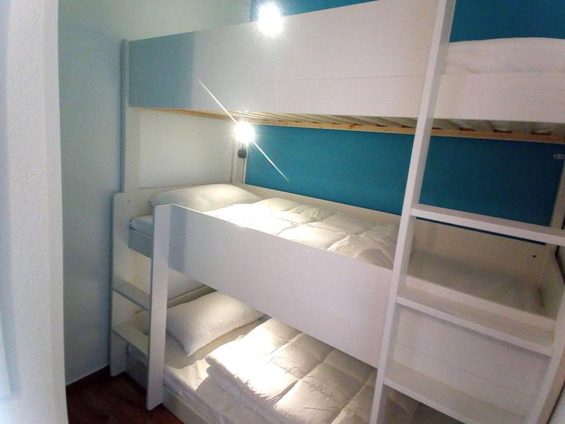 Fläche von ungefähr 42 m². Wohnzimmer mit Ausziehschlafcouch für 2 Personen (2x80). Schlafzimmer mit Doppelbett (140). offener Schlafbereich mit 3 Stockbetten (90). Kochnische mit Fonduegerät, Raclettegerät, Wasserkocher, Kaffeemaschine (filtre et senséo), Mikrowellengrill, Toaster, Geschirrspülmaschine, 3 Induktionsherdplatten, Kühlschrank. Waschräume mit italienische Duschkabine. separates WC. Die oberen Betten sind nicht für Kinder unter 6 Jahren geeignet.