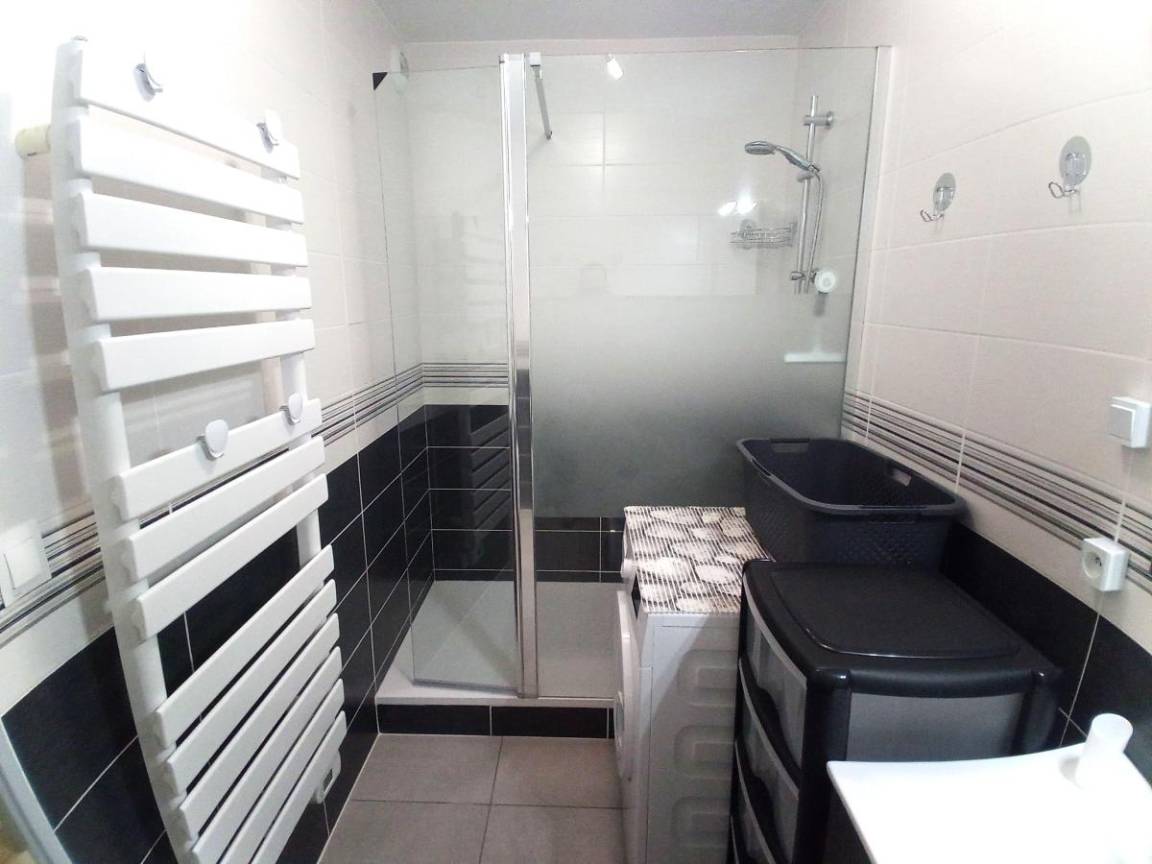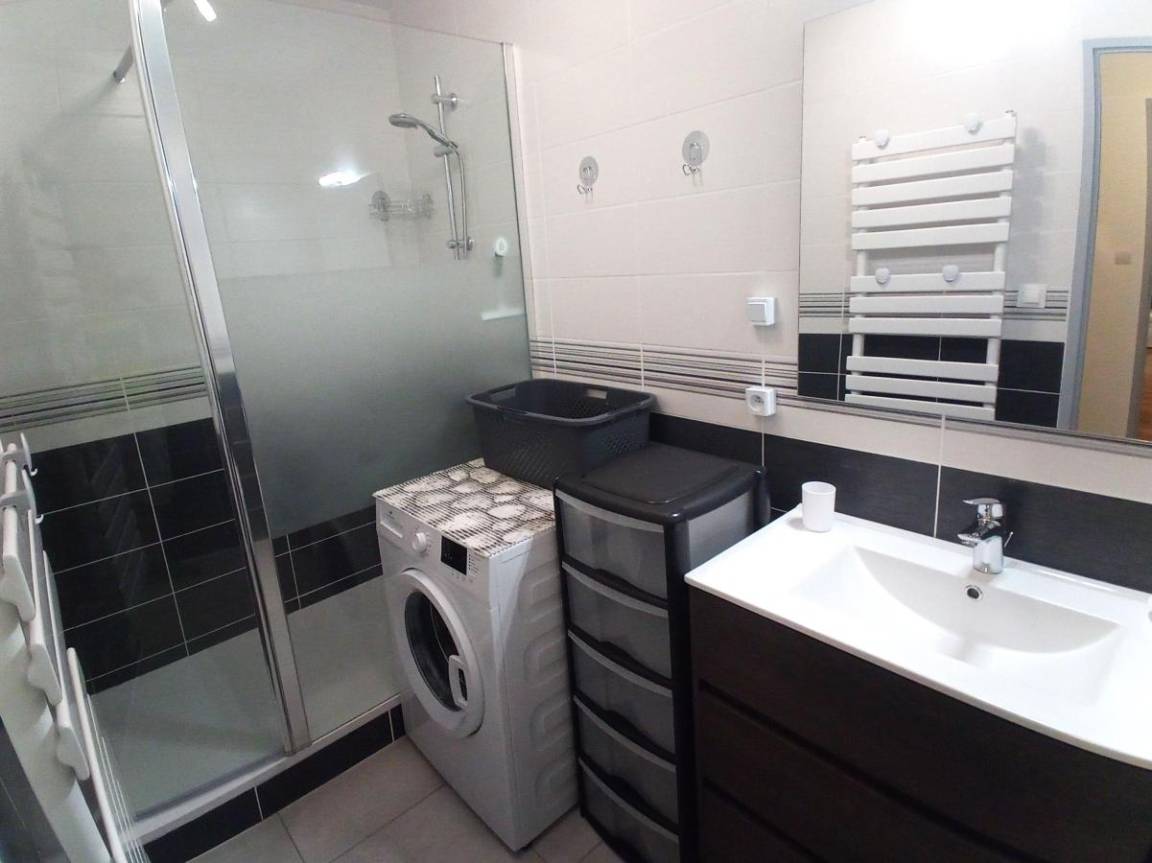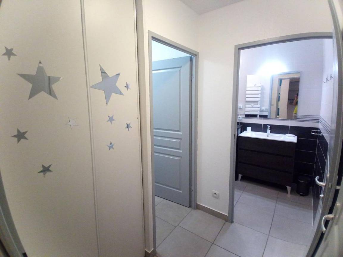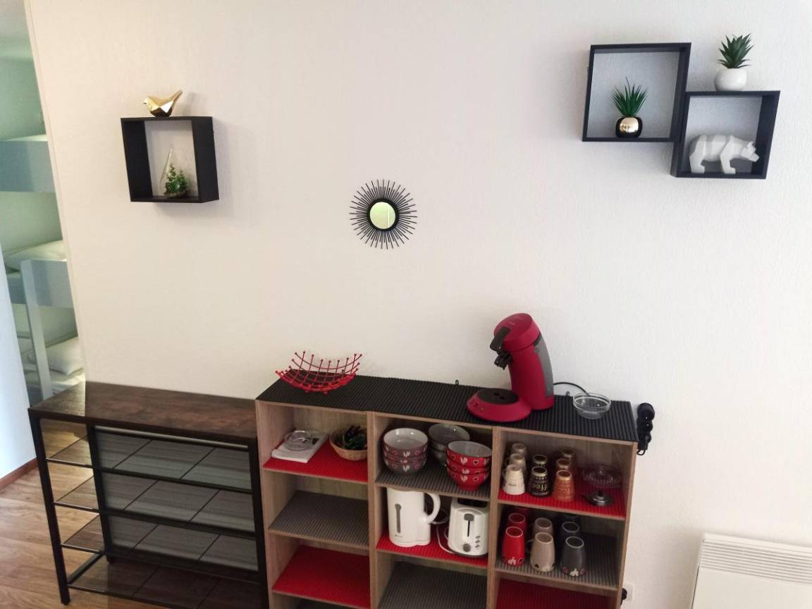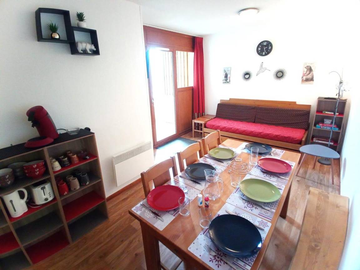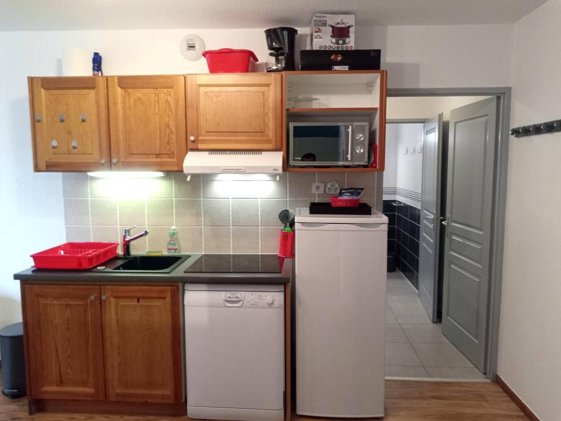 Fläche von ungefähr 42 m². Wohnzimmer mit Ausziehschlafcouch für 2 Personen (2x80). Schlafzimmer mit Doppelbett (140). offener Schlafbereich mit 3 Stockbetten (90). Kochnische mit Fonduegerät, Raclettegerät, Wasserkocher, Kaffeemaschine (filtre et senséo), Mikrowellengrill, Toaster, Geschirrspülmaschine, 3 Induktionsherdplatten, Kühlschrank. Waschräume mit italienische Duschkabine. separates WC. Die oberen Betten sind nicht für Kinder unter 6 Jahren geeignet.