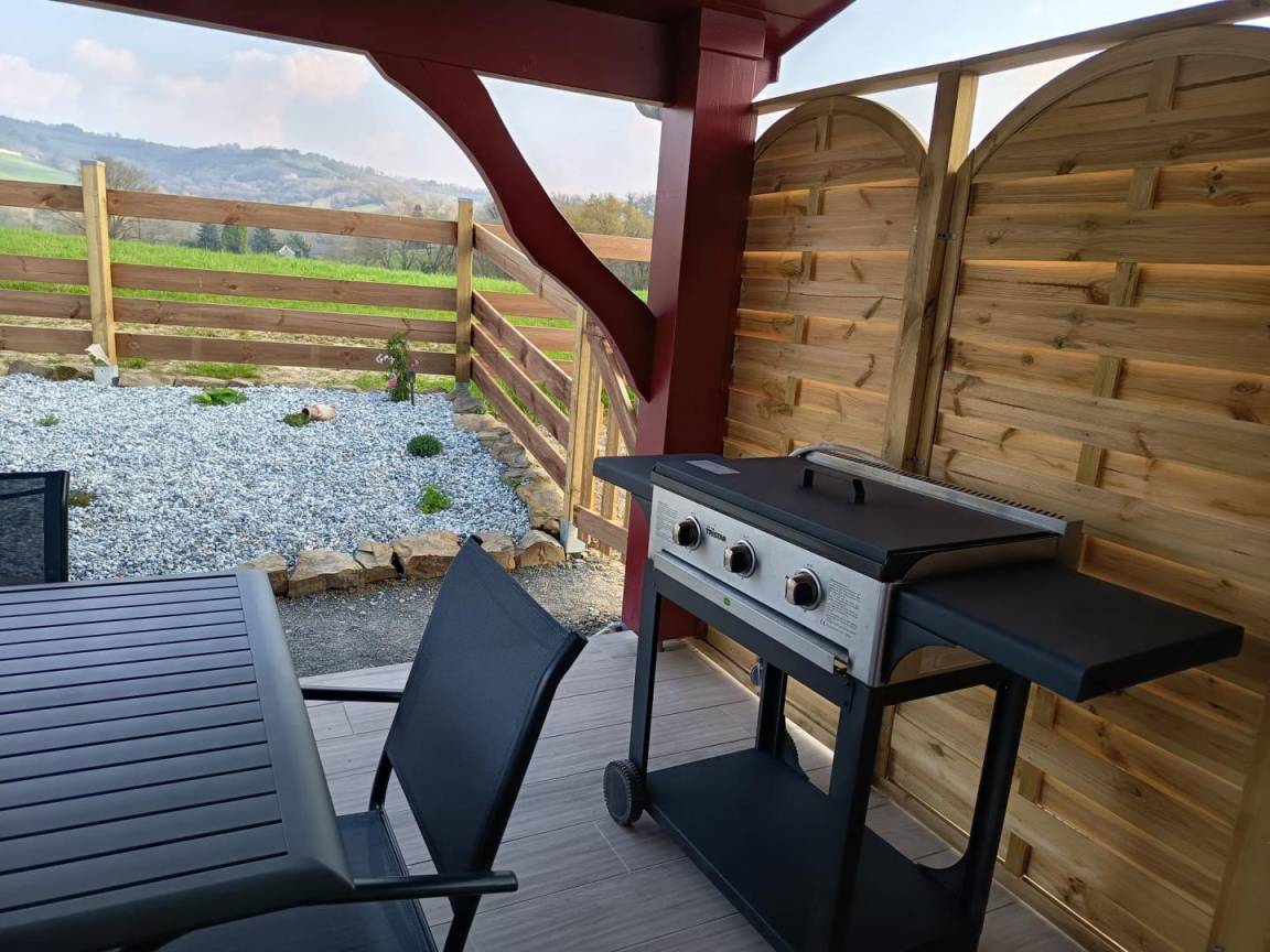 Verfügbar. Draußen erwartet Sie ein angenehmer Bereich mit einer überdachten Terrasse, ausgestattet mit Gartenmöbeln und einem Grill.