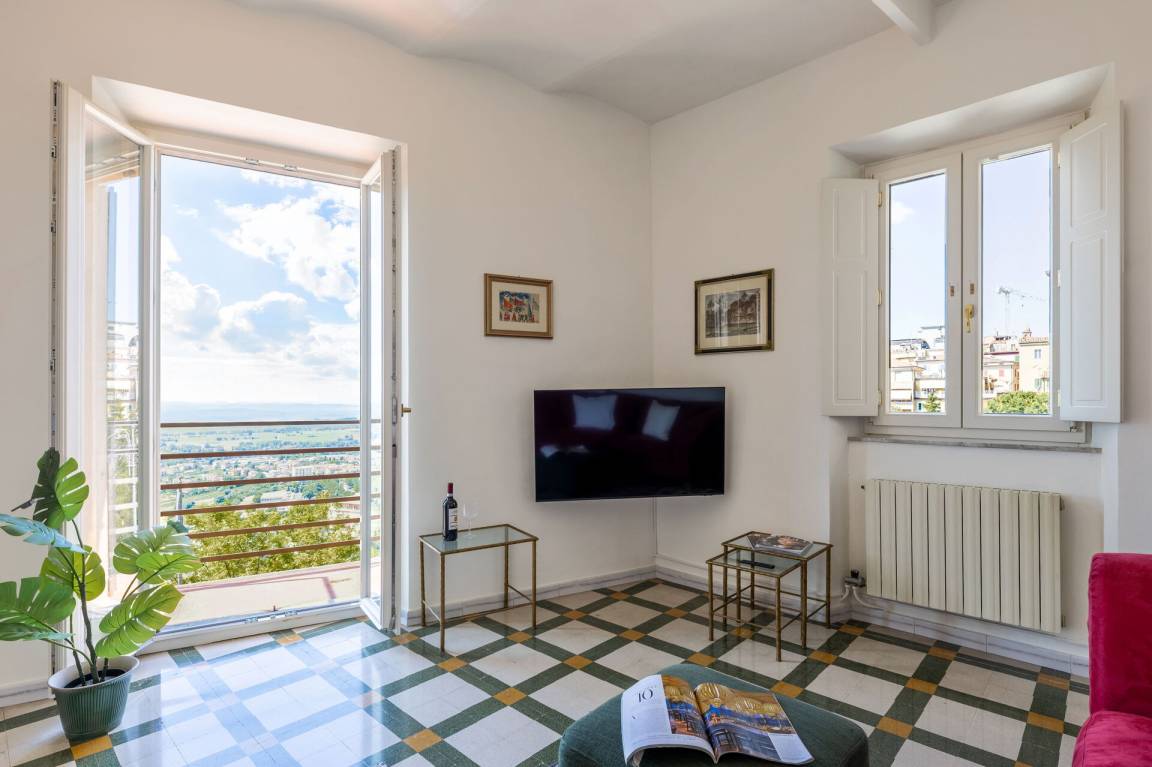 Wohnzimmer: Sofa, Schreibtisch, Esstisch, WiFi Internet, Internet, Satelliten-TV, Ausgang auf den Balkon.
