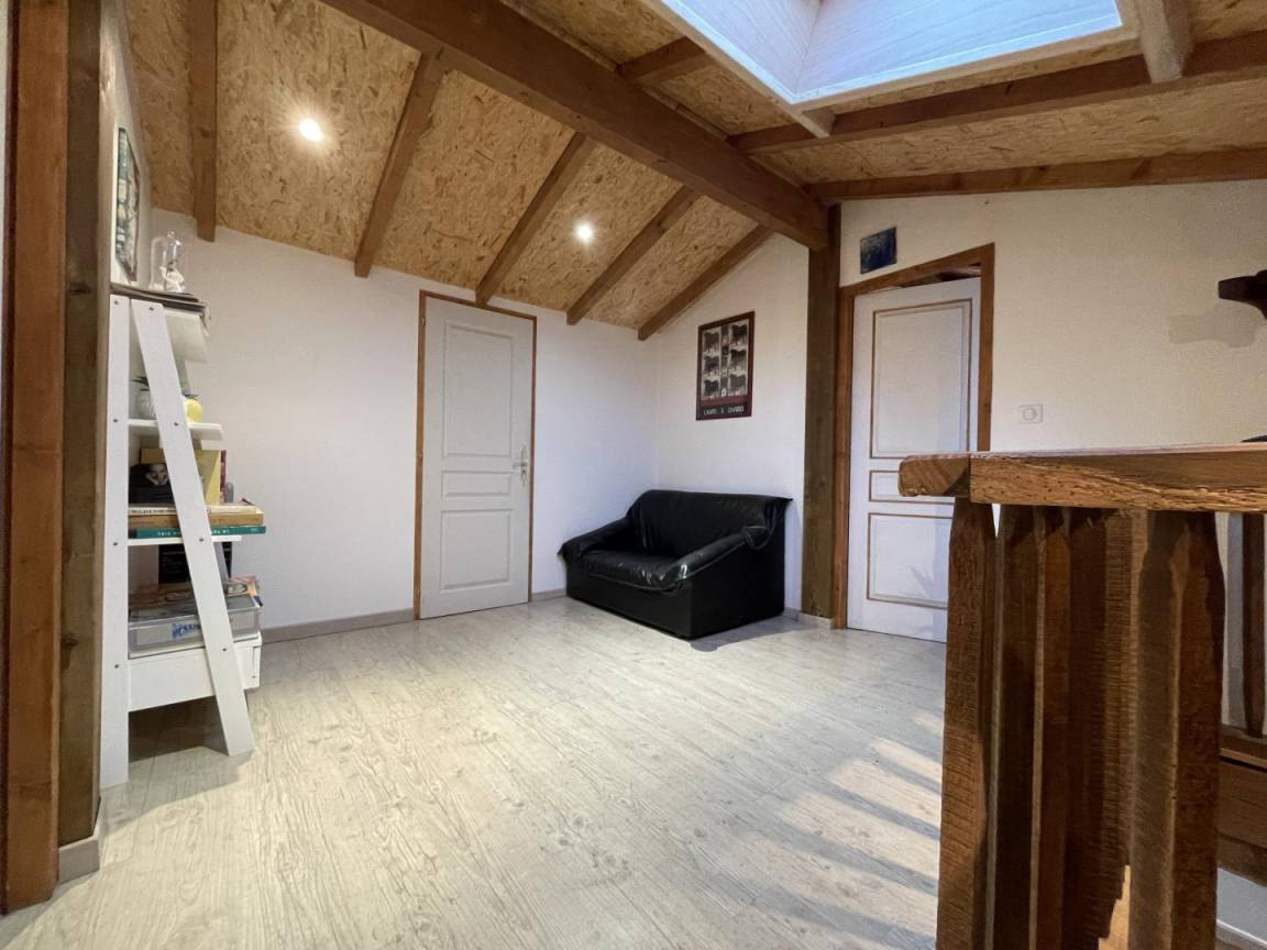 Obergeschoss: 2 Schlafzimmer (2 Doppelbetten, 1 Einzelbett), WC + Waschbecken, Ruhebereich auf dem Treppenabsatz.