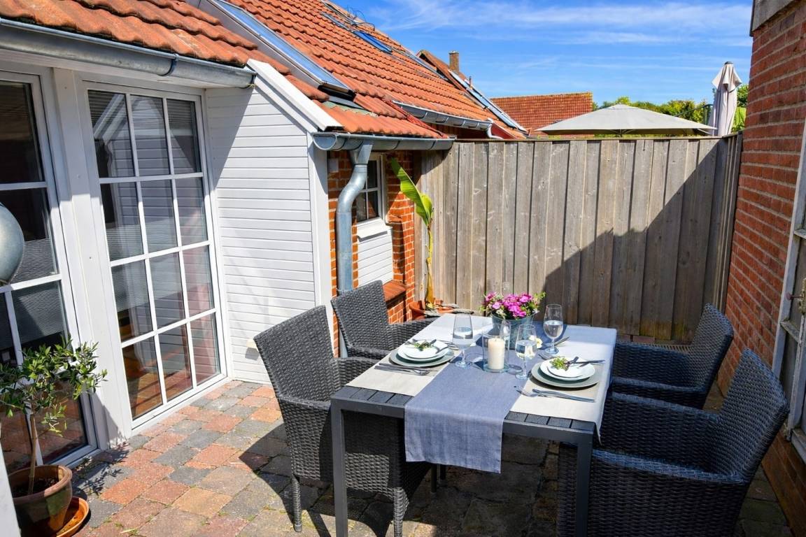 Der großzügige Außenbereich ist ein echtes Highlight. Ein gepflegter Garten mit Terrasse, Strandkorb, Sitzmöbeln und Holzkohlegrill lädt zum Verweilen ein. Zwischen zwei alten Birken schwebt eine Hängematte mit direktem Blick auf das angrenzende Kornfeld – ein wunderbarer Ort zum Abschalten, Lesen oder Träumen.
