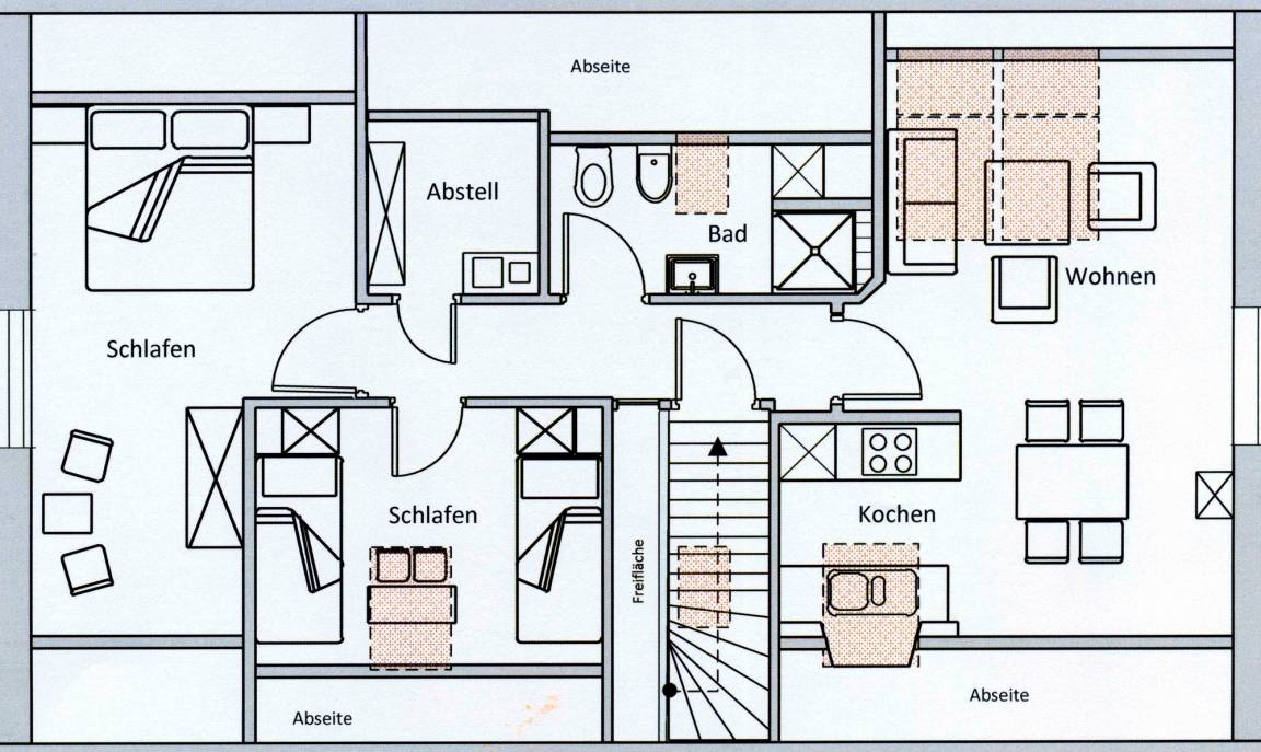 Es sind zwei Schlafräume vorhanden, eines mit Doppelbetten, hier kann ein Babybett zugestellt werden. Der weitere Schlafraum hat zwei Einzelbetten. Ein kombiniertes Wohn- und Esszimmer mit angrenzender Küche, sowie ein Badezimmer mit Duschbad laden Sie zum Verweilen ein.