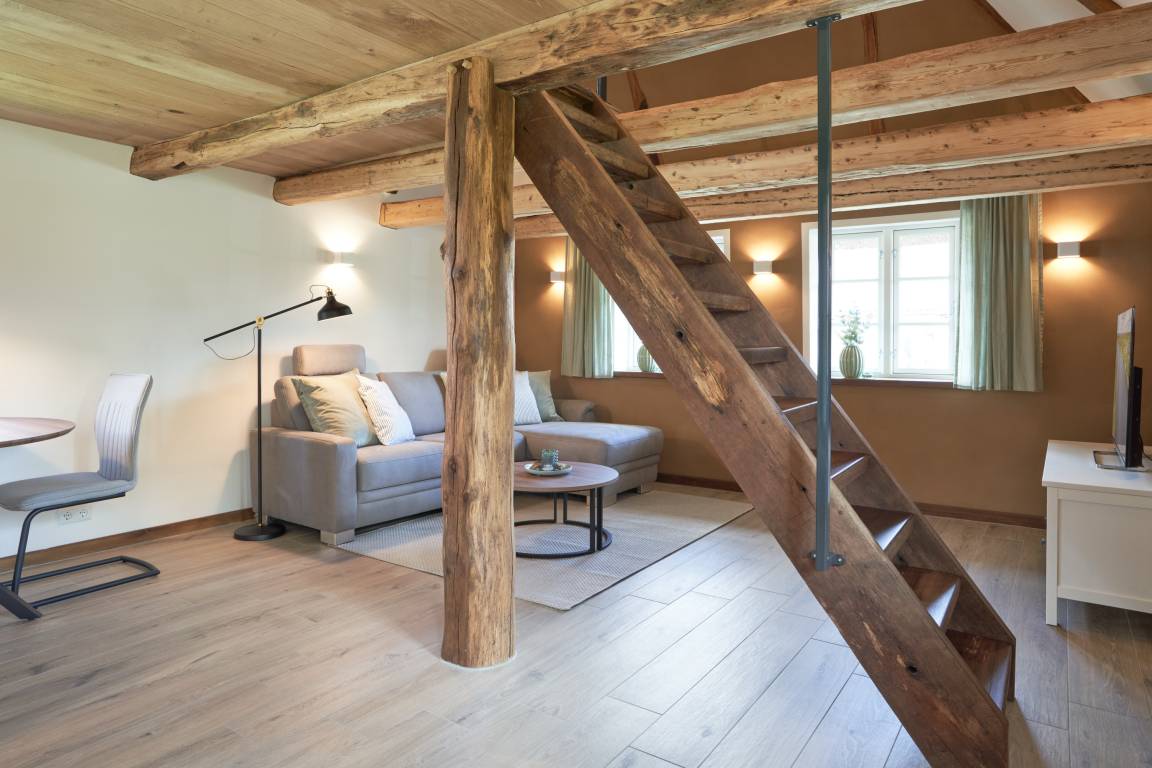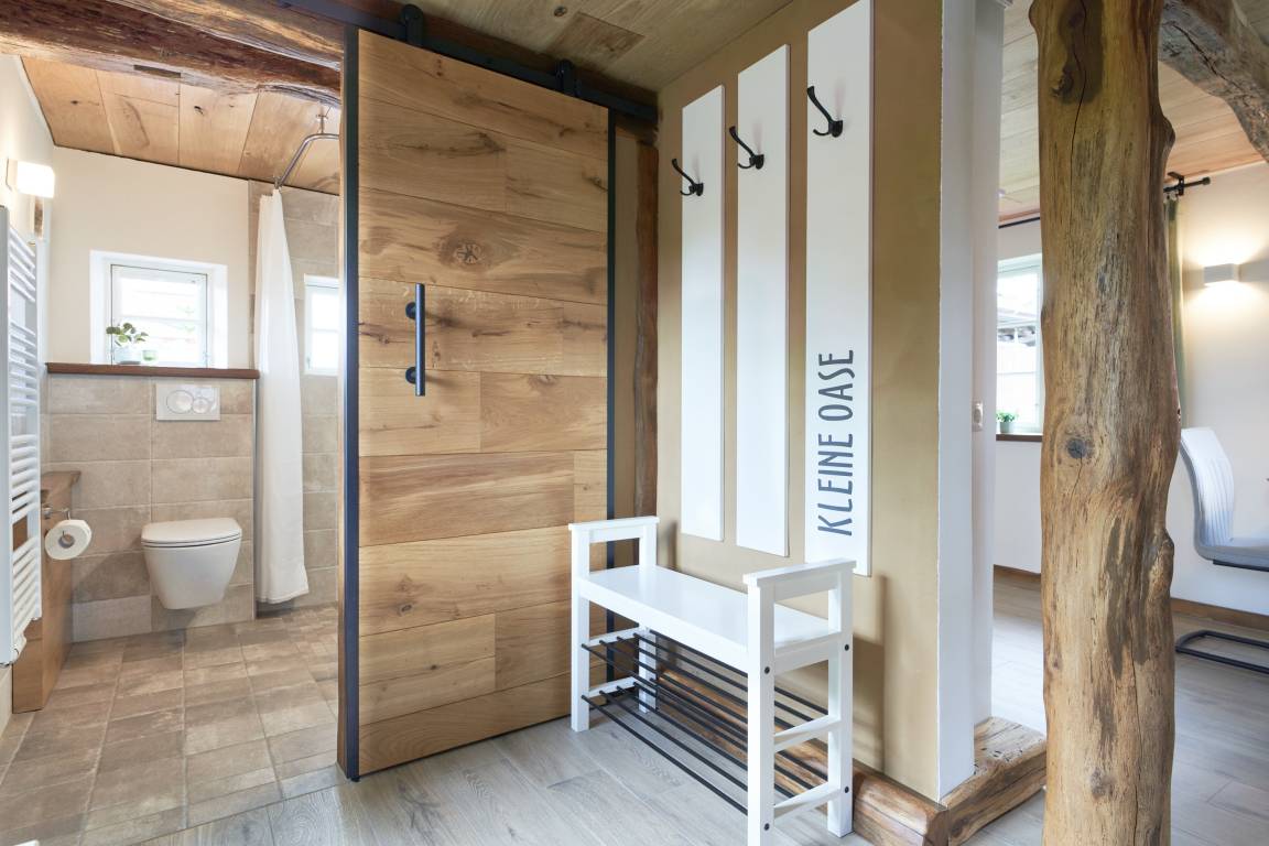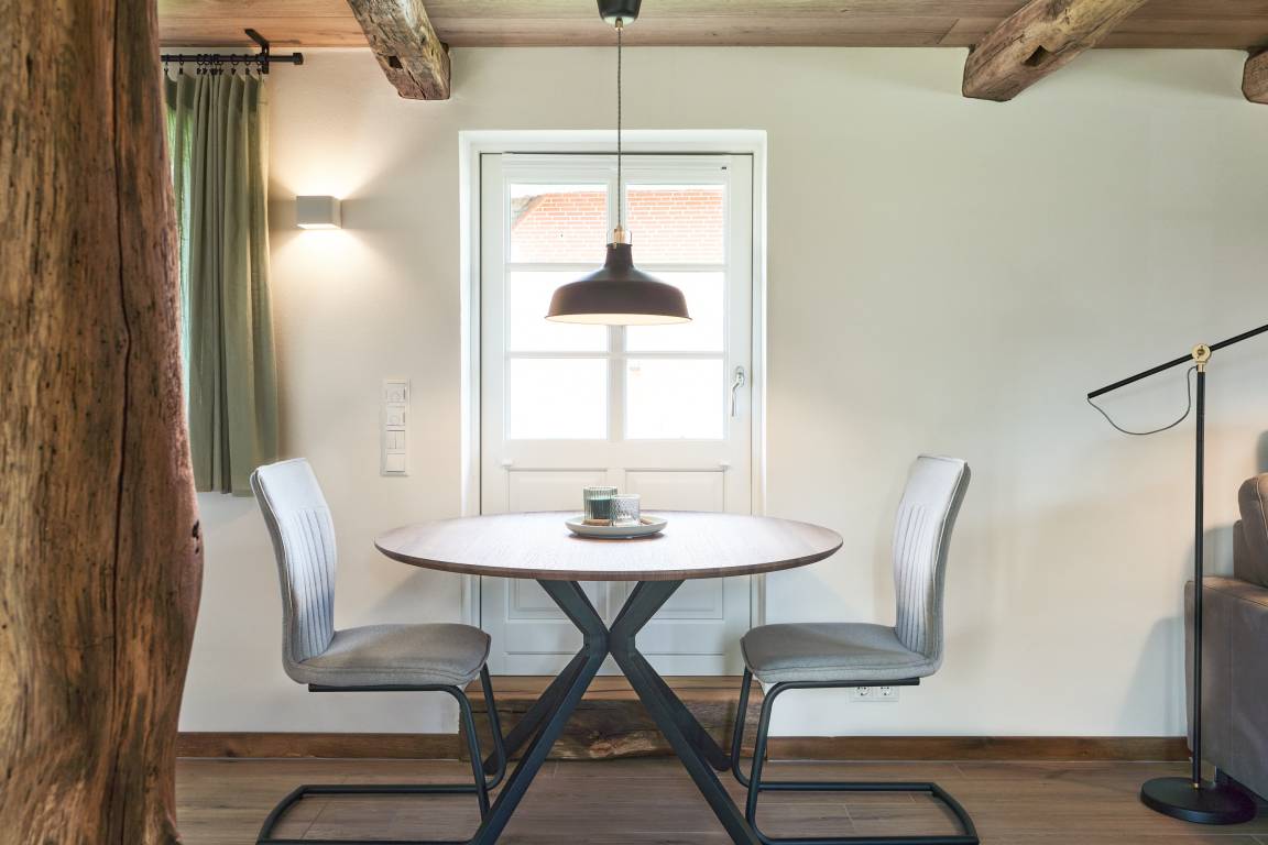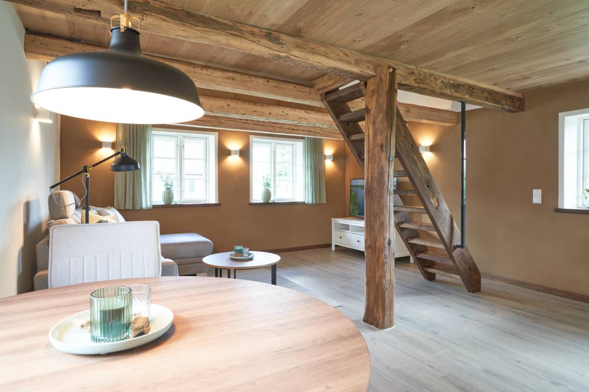 Willkommmen in der Kleinen Oase! Hier begrüßen Sie ein angenehmes Klima und erdende Farben. Bei der Renovierung wurden vor allem Naturmaterialien verwendet. Die Wände wurden mit Lehm auf einer Holzfaserdämmung verputzt und zum Teil mit einer atmungsaktiven Lehmfarbe weiß gestrichen. Alle alten Balken des Hauses wurden in liebevoller Kleinstarbeit freigelegt und mit Leinöl restauriert. Die Kombination aus Holz und Lehm ergibt ein irdenes Aroma und lässt Sie sogleich entspannen. Die Farben der Inneneinrichtung holen die Natur ins Haus. Der sandige Lehmputz und das Grün der Dekoration ergänzen sich gemeinsam mit den Holzbalken und den handgefertigten Eichen-Fensterbänken zu einer Oase. Der Fußboden im Wohn- und Küchenbereich ist gefliest und wird über eine Fußbodenheizung temperiert. Hinter dem bequemen Ecksofa befindet sich ebenfalls eine Wandheizung. Besonders an kalten Tagen hat man dadurch das Gefühl, ein Ofen würde die Wohnung heimelig erwärmen, während Sie Ihren Abend vielleicht bei einem Glas Wein vor dem Flat-TV ausklingen lassen. Die Wandbeleuchtung illuminiert dabei den Raum in warmen Licht.