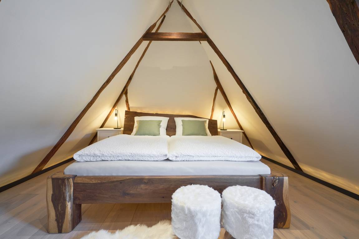 Von der Galerie aus blicken Sie nach unten in den Wohnbereich. Sie befinden sich nun im Schlafzimmer mit kleiner Dachgaube. Auf den Regalen und in den Nachttischen lassen sich Ihre mitgebrachten Sachen verstauen. Je nach Bedarf können Sie die helle Deckenbeleuchtung oder die urige Wandbeleuchtung hinter der Fußleiste, die auch das 1,80 m x 2,0 m große Bett umrahmt, wählen. Das Bett wurde extra für die Kleine Oase in alter Handwerkskunst mit Zapfenverbindungen aus über 200-jährigem Eichenholz getischlert. Hier werden Ihre Träume wahr.
