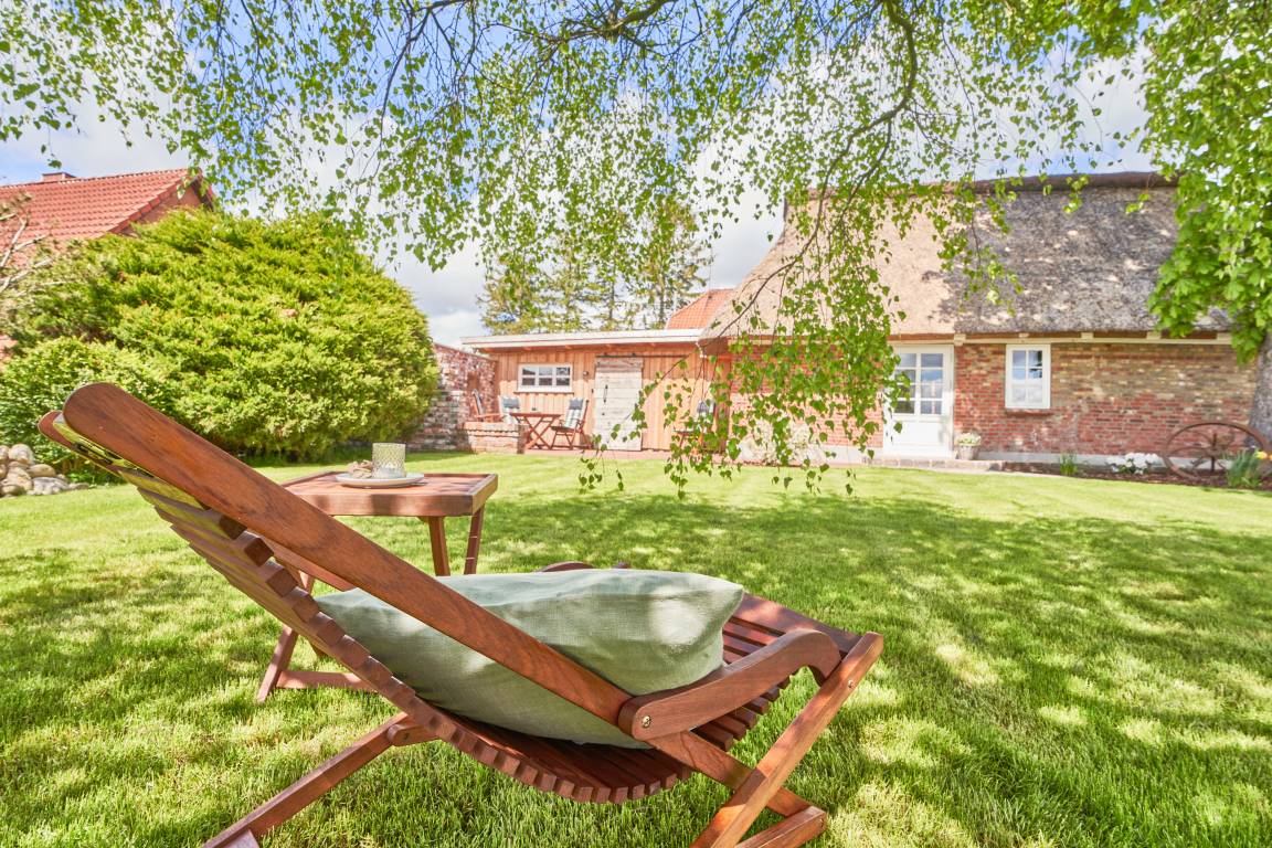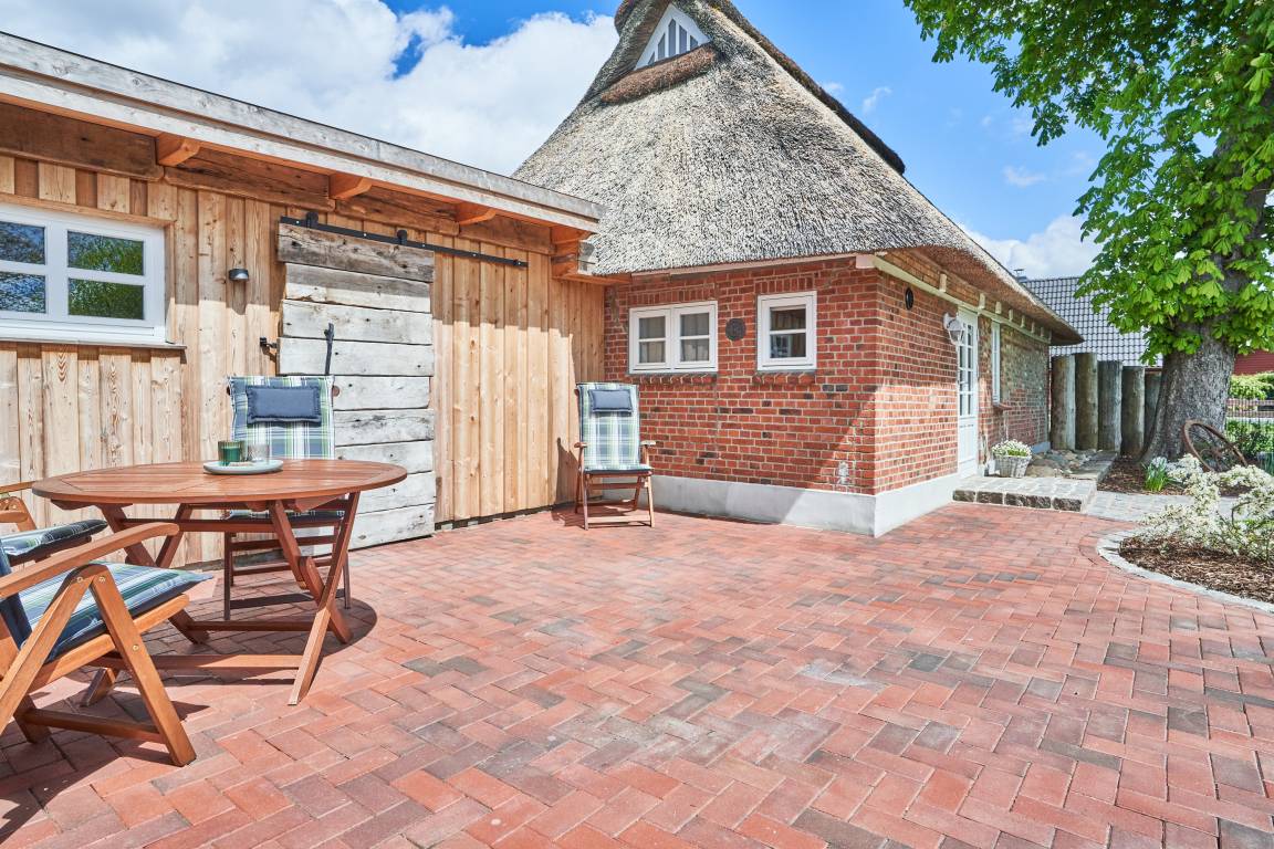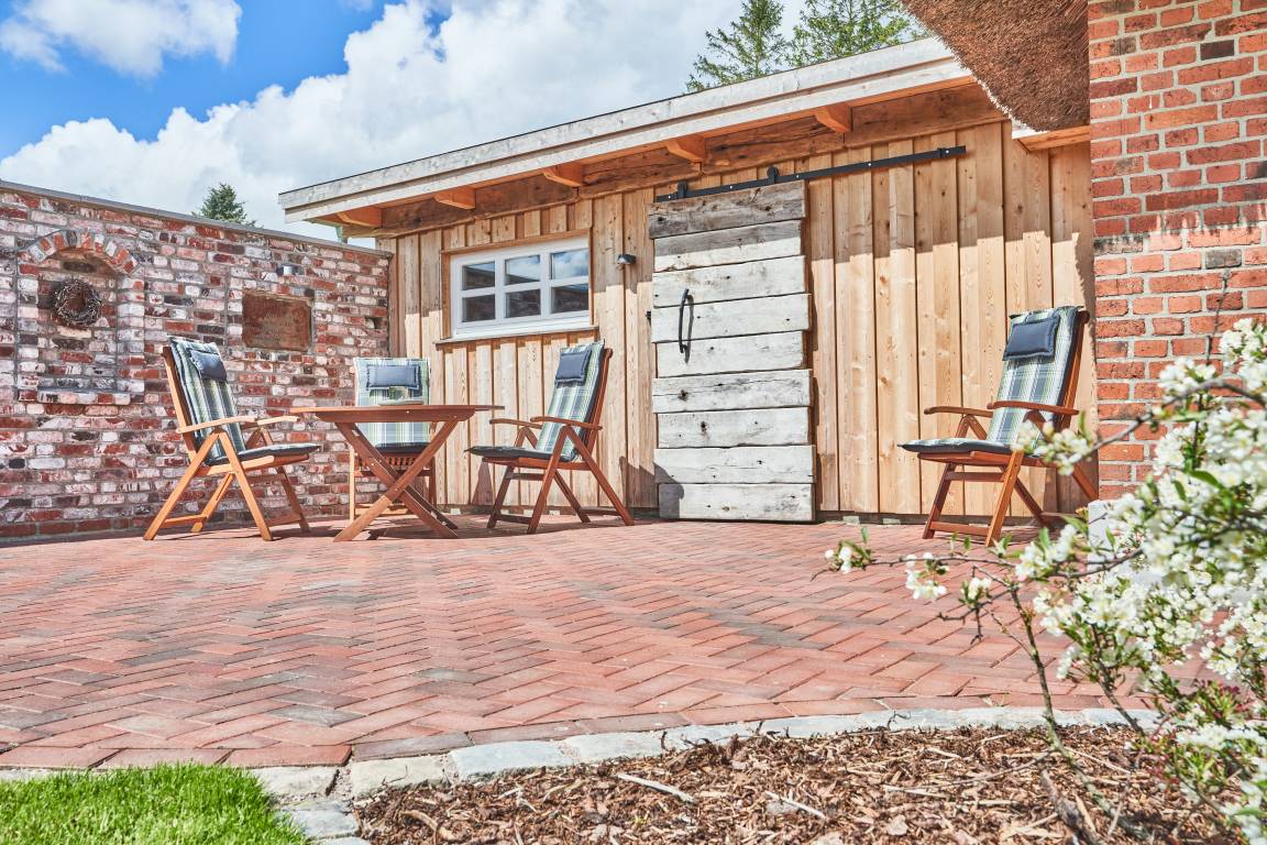 Eine neu angelegte 30 m² große Terrasse grenzt in Süd-Westausrichtung an die Kate. Auch hier gibt es wieder einige Hingucker, die charmant den alten Charakter des Hauses aufgreifen. Selbstverständlich warten im neu errichteten Holzschuppen mit Naturdach Gartenmöbel und eine Grillausstattung auf Sie. Zudem können Sie Ihre Fahrräder im abschließbaren Schuppen abstellen und E-bikes aufladen.
