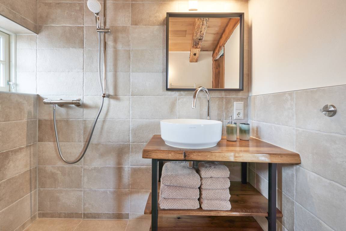 Gleich neben der Eingangstür befindet sich hinter einer Schiebetür das Bad. Die kleine Nasszelle mit Fußbodenheizung bietet durch die geschickte Raumaufteilung alles, was Sie benötigen. Die Tür und der Waschtisch sind Unikate, die vom Gastgeber eigens für die Kate gefertigt wurden. Das trifft auch auf die steile, schmale Stiege zu, die sie entlang der offenen Galerie unter das Dach nach oben führt.