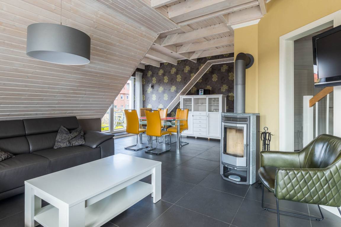 Im gemütlichen Wohnbereich auf der ersten Wohnebene erwarten Sie neben einer großen Couchecke ein großer Flatscreen-TV und eine Stereoanlage, so dass für Unterhaltung gesorgt ist. An kühleren Tagen sorgt hier ein Kamin für kuschelige Stunden.